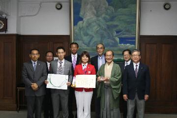 この度,リオデジャネイロオリンピック アーチェリー女子団体において,見事第8位に入賞された,林勇気選手が京都市役所を訪れ,門川市長から京都市スポーツ栄誉賞が贈られました。