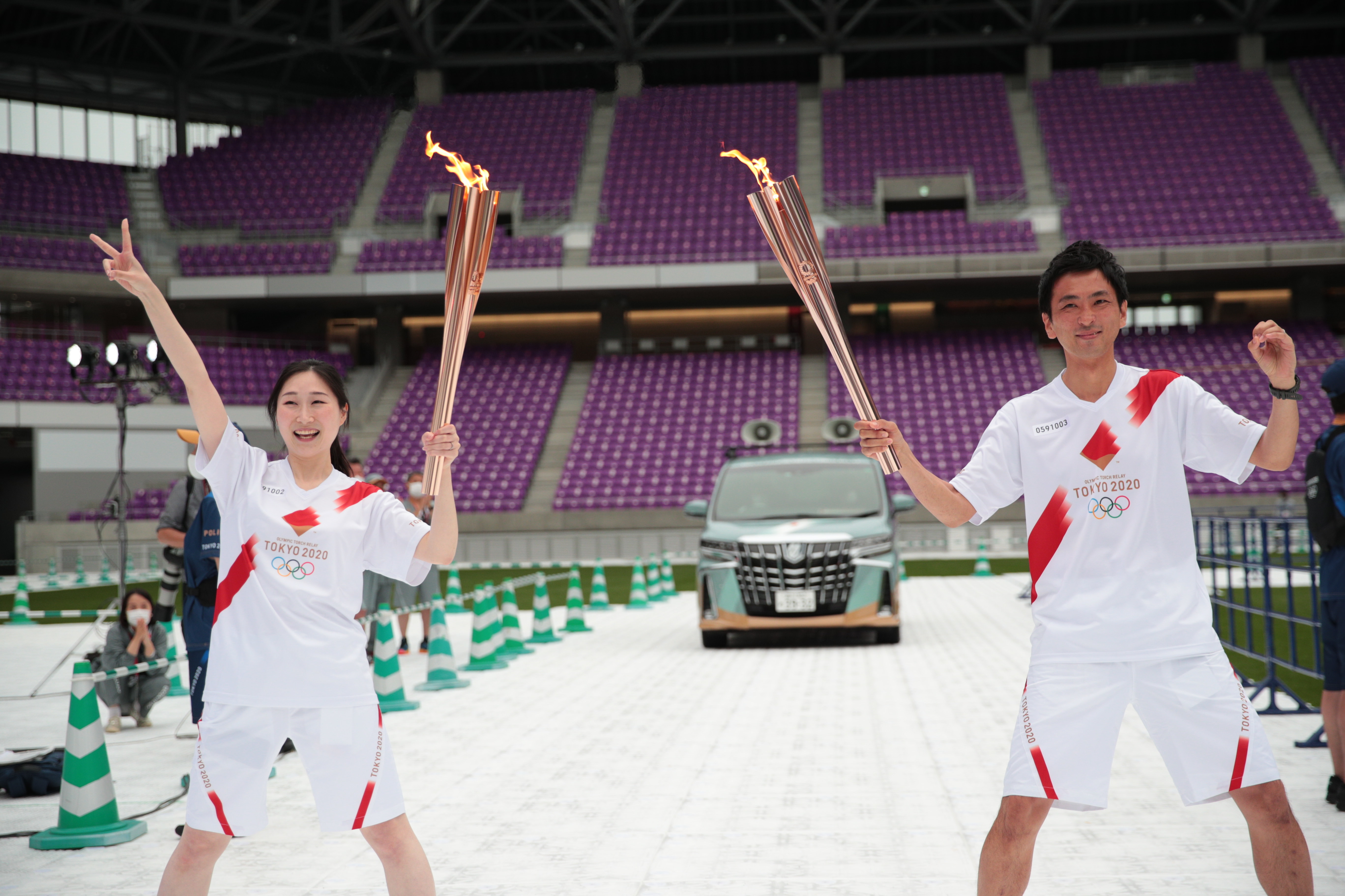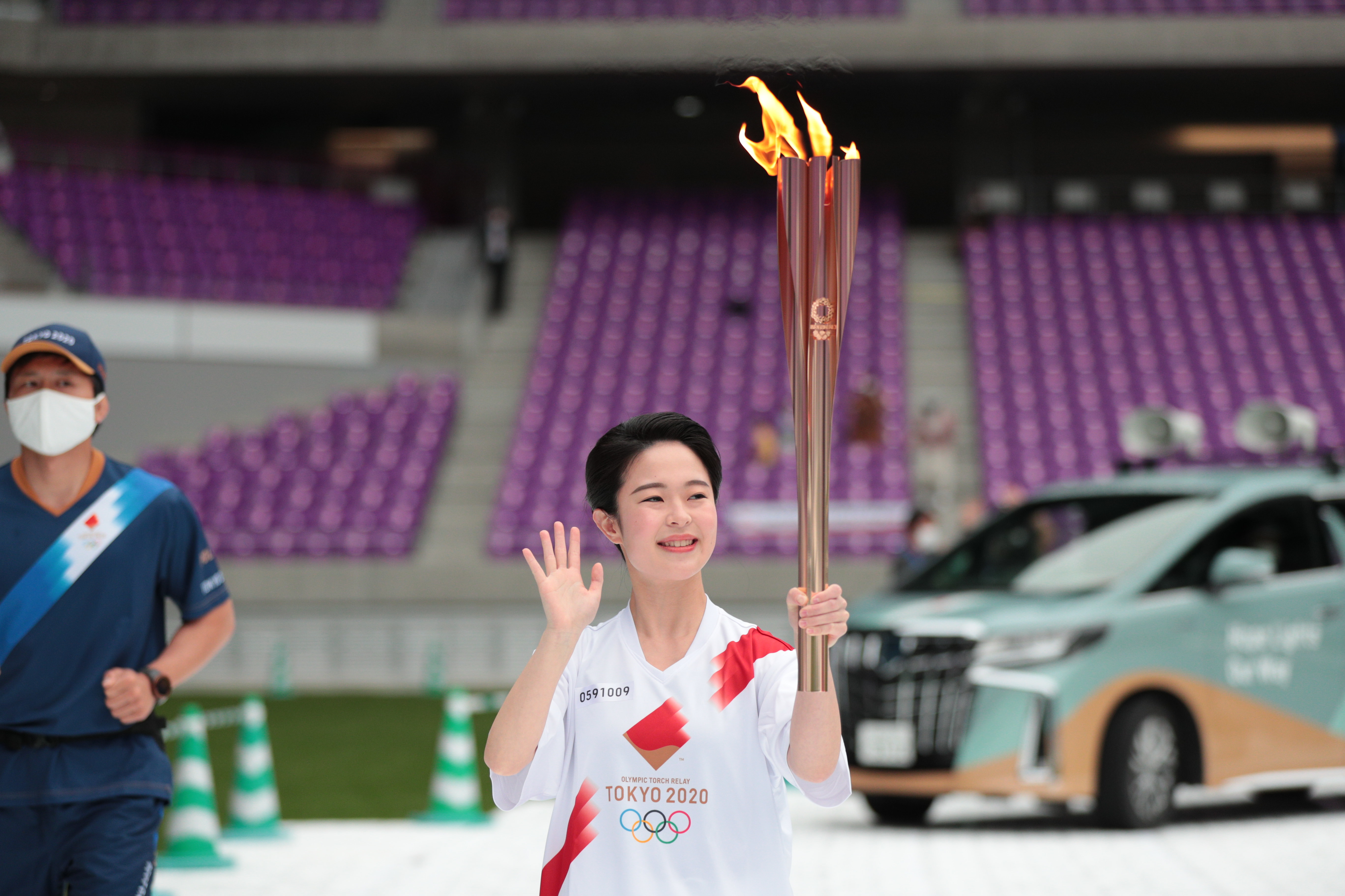 令和3年5月25日(火曜日),26日(水曜日)の2日間にわたり,亀岡市の「京都府立京都スタジアム」で京都府の聖火リレーが無観客で行われました。