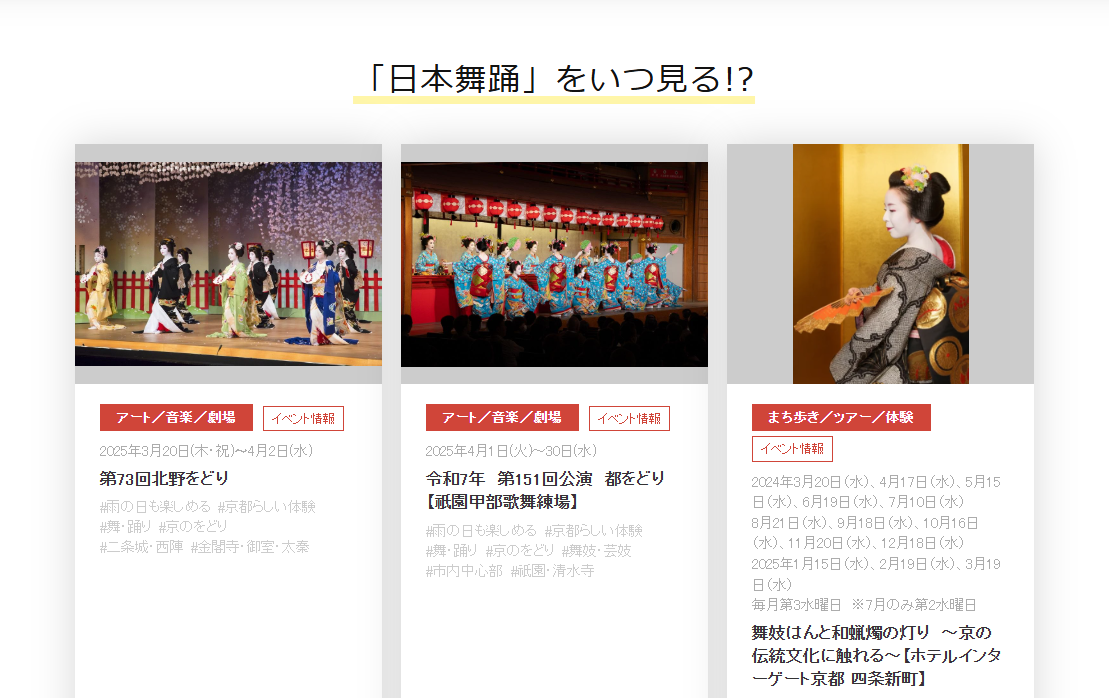その一環として、この度、京都を訪れる観光客の皆様に、京都の伝統文化に興味を持っていただき、京都を訪れる際に観賞いただくため、特設ページ「京の伝統文化」を京都観光オフィシャルサイト(京都観光Navi)内に開設しました。