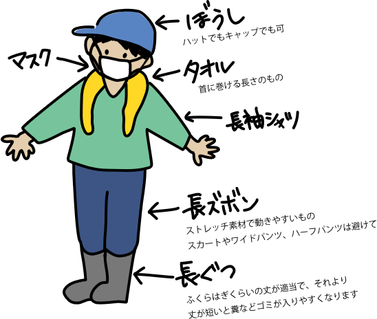- 動きやすく、汚れてもよい服装(長ズボン)で参加してください。