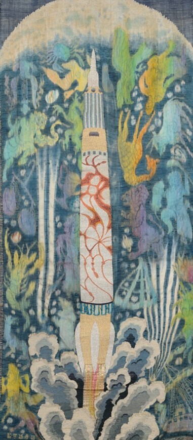 祭礼時の懸想品などには天女や雲龍といった伝統的な図柄を、公募展への出品作の壁掛などには機関車、ロケット、東京タワーといったユニークなモチーフを用いたように、山鹿の主題選びは実に多様で奇抜です。彼は明治、大正、昭和にわたり染織の伝統継承に努める一方で、進取の気風にも富んだ稀有な存在だったといえるでしょう。本展は山鹿清華の仕事を振り返る、40年ぶりの回顧展です。