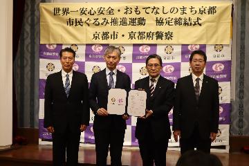 会議終了後の同日、協定締結式にて、松井京都市長、吉越京都府警察本部長が新たな協定書に署名を行い、これまでの期間を設定した協定から、京都市・京都府警察との間に永続的となる協定が締結されました。