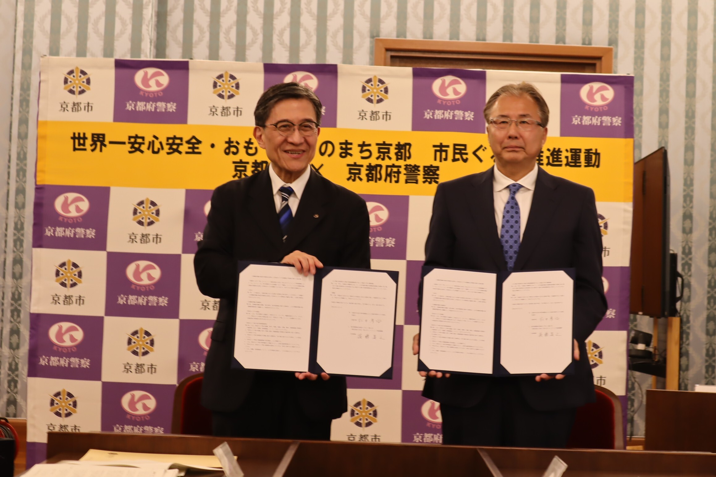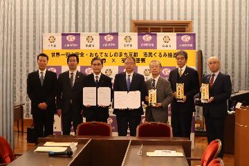 協定締結式では、京都市内における公園への防犯カメラの設置を促進し、子どもたちが安心、安全に遊べる空間の環境整備を行っていくため、松井京都市長と、本事業のスキームを持つ一般社団法人安全・安心まちづくりICT推進機構の代表理事が協定書に署名を行い、双方間での協定が締結されました。