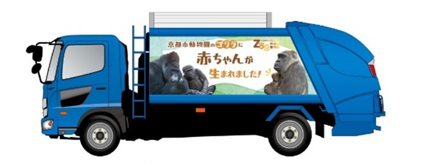 また、京都市動物園を応援いただいている株式会社木下カンセー様のご協力により、ゴリラ誕生を記念して運行いただくラッピングカー(パッカー車)のお披露目及び寄付受納式を行います。