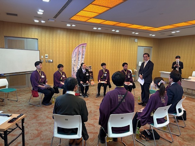 京都市バス“おもてなしコンシェルジュ”(※)の学生や本事業に関わる方々にお集まりいただき、京都市バス“おもてなしコンシェルジュ”の活動と京都学藝衆構想への貢献の可能性をテーマに、松井孝治京都市長を交えて意見交換を行いました。
