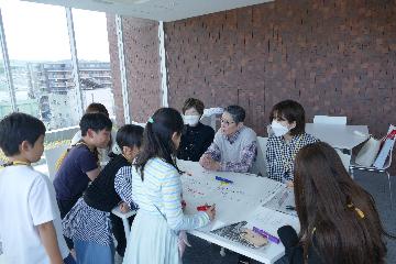 地図を学んだばかりの小学生が、おすすめの店や好きな場所等などを付箋に書いて貼っていくとともに、その理由を地域の大人、学生に伝えていきます。地域の大人は、その話を聞きながら昔の砂川の話をし、過去と現在の話から、砂川の未来へとつなげていきます。