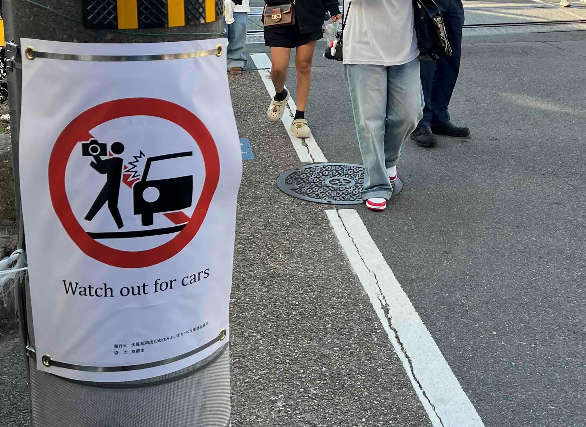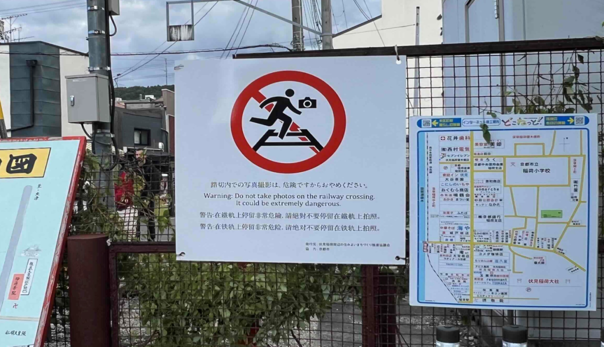 国土交通省観光庁作成の訪日観光客向け「観光ピクトグラム」の効果を検証するため、観光客のマナー啓発を推進する実証調査を実施しました(令和7年11月4日から12月15日まで)。調査期間中は、地域住民や商店等で構成する「伏見稲荷周辺の住みよいまちづくり推進協議会」が中心となり、龍谷大学の学生の協力も得ながら、地域内の踏切や電柱にピクトグラム看板を設置し効果を検証するとともに、観光マナー啓発を行いました。
