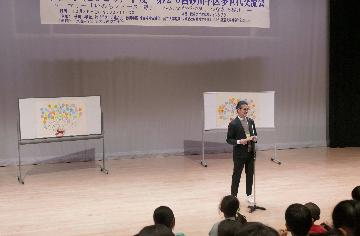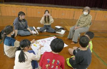 グループごとにレクリエーションを行い、より交流が深まったところで、砂川学区の良いところ、みんなが幸せに暮らすために砂川学区にあったら良いもの、自分たちができることを話し合い、砂川小学校の子どもたちが発表しました