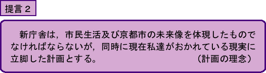 - 市庁舎整備は緊急の課題であるが,まちづくりについては京都市の将来構想を踏まえて論議するべきで,慎重な取り扱いが必要である。
