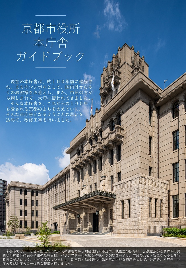 令和3年8月末に改修工事が完了した本庁舎の特徴、見どころを紹介しています。京都市が制作したオフィシャルガイドブックです。