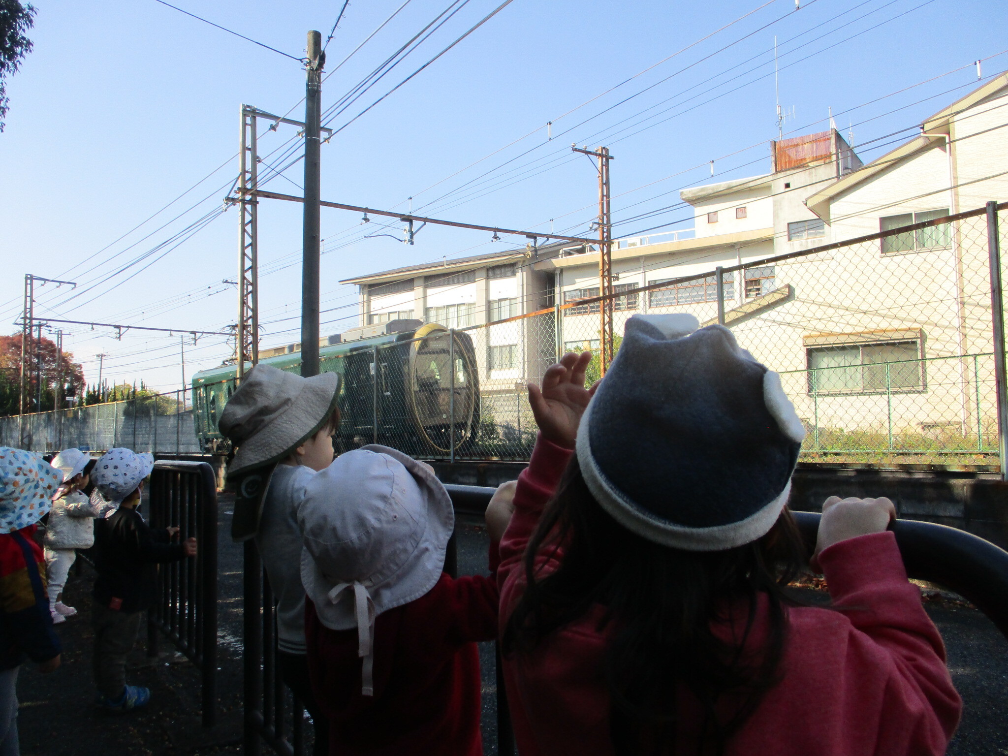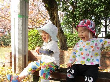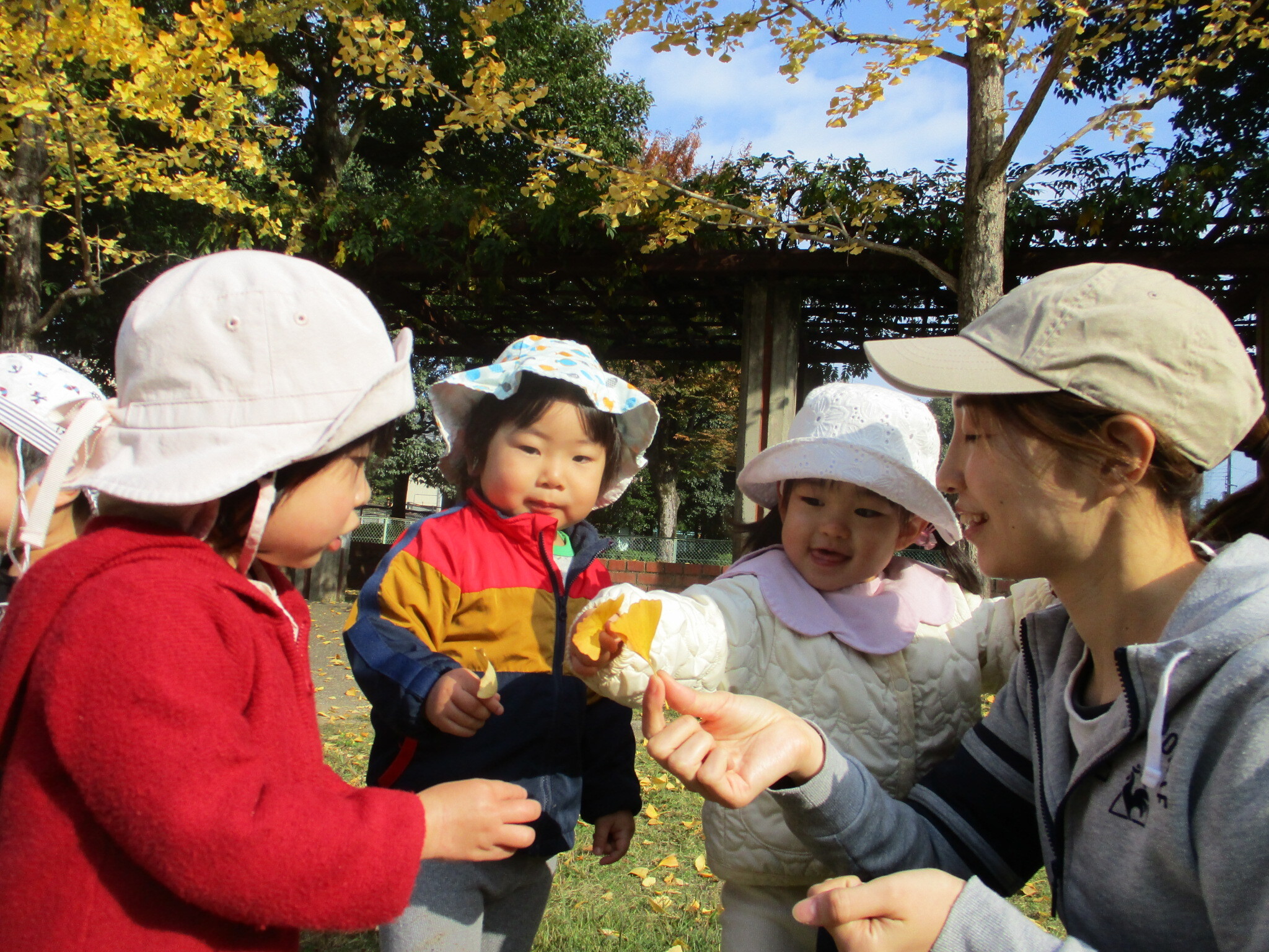 「しー(むし)いた」と園庭で動いている小さな生き物たちに興味津々の子どもたちです。友だちにも興味がたくさん出てきた子どもたち。空高く飛ぶ蝶を見つけると空を見上げて「ちょうちょ」と追いかけたり、保育士が「ちょうちょう、ちょうちょう、なのはにとまれ」と歌いだすと一人が手を広げて蝶になりきって走り出したりします。すると、手を広げて蝶になる子どもが次から次へ。嬉しそうに笑いながら蝶になるかわいい姿があります。また「だんむし(だんごむし)」と言って、2歳児のらいおん組の友だちがたくさん見つけているところに近付き、恐る恐るツンツンと触る子どもたちもいます。今では手に乗せて友だちに得意げに見せに行く姿もでてきています。「ありしゃんいる(あり)」と砂の上を大急ぎで歩いていくありたちをみんなで追いかける姿もみられます。小さいけれど動きはとても早く予測不可能なので子どもたちも一生懸命追いかけます。「あんまりいそいでこっつんこ」とありの歌に合わせて体を揺らしノリノリになりながら“いるいる”“みて、そこにいるよ”と何人かでちょこんと並んで虫探しをする姿がとてもかわいいです。
