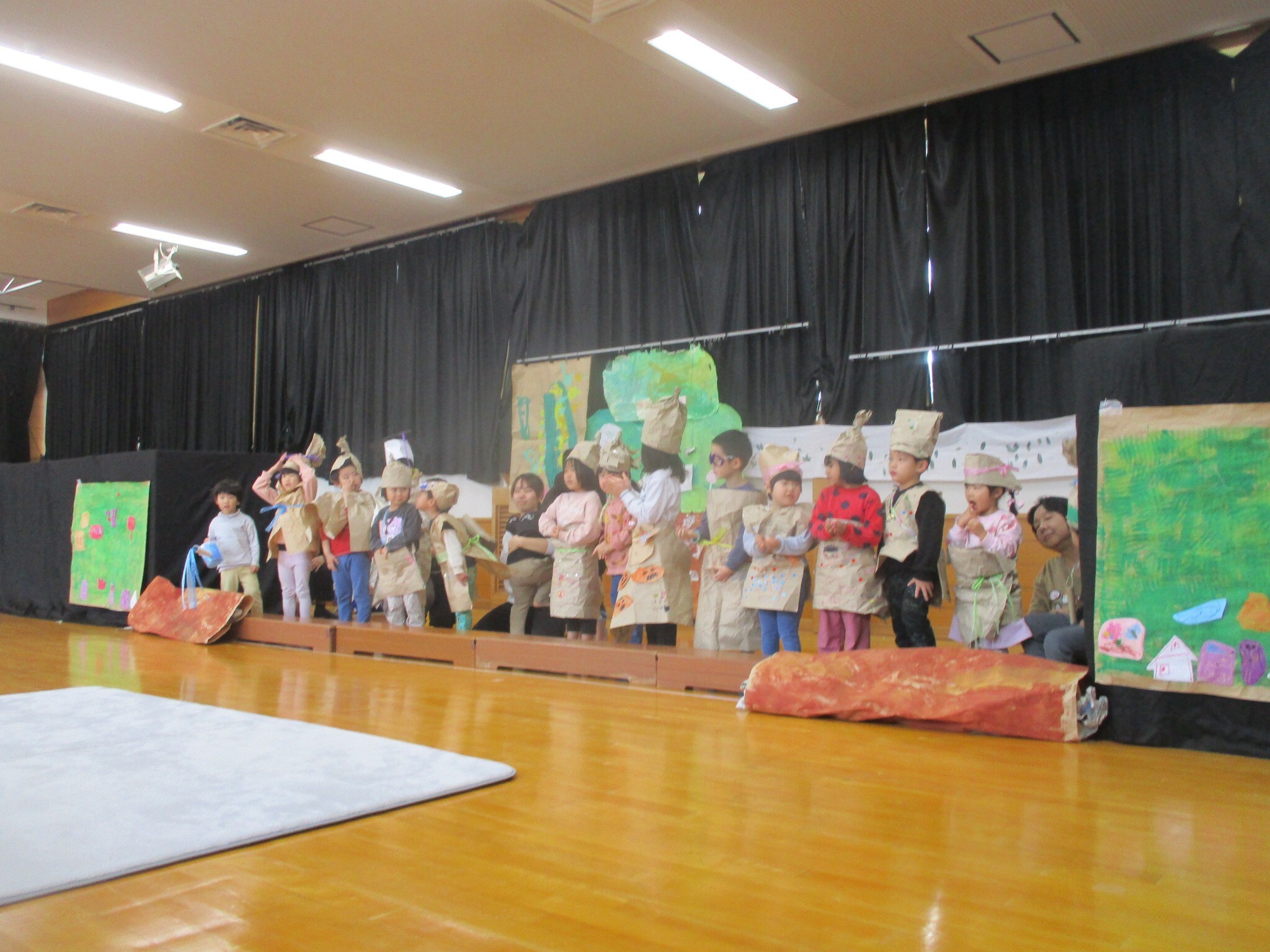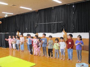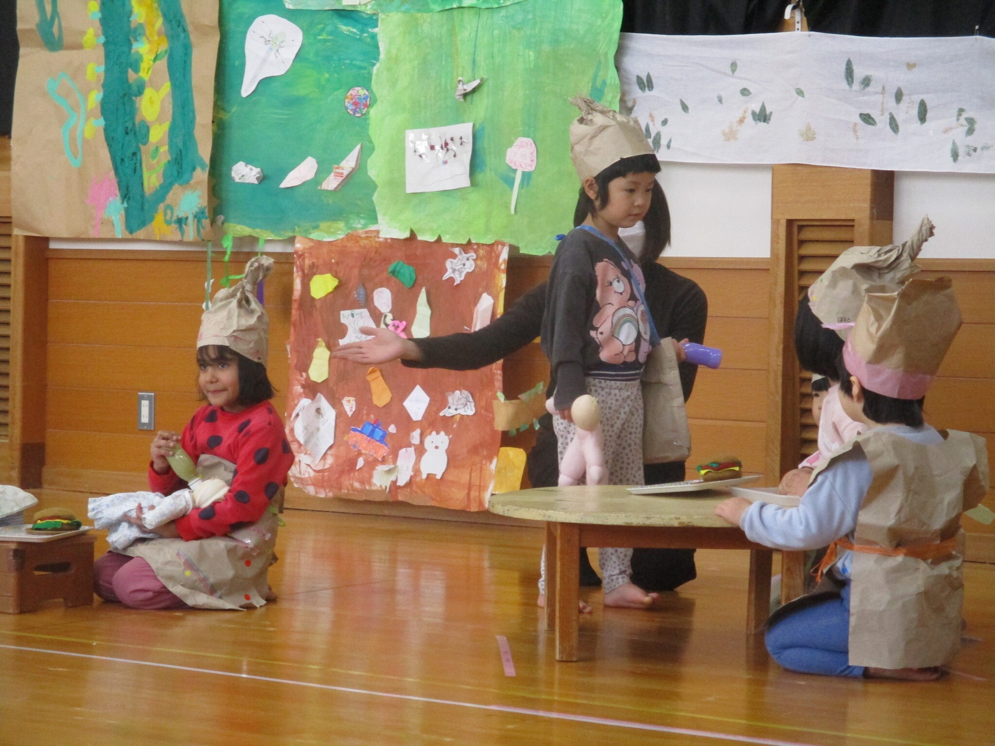 たくさんちぎった後は、紙を傘の中に集めて…傘をくるくる回すと、寝転ぶ子どもたちの上にパラパラと紙吹雪が降ってきました。初めは不思議そうにしていた子どもたちでしたが、回数を重ねるうちに、率先して紙を集めたり、寝転んで紙吹雪を待ったりと、わくわく楽しそうな姿が見られました。