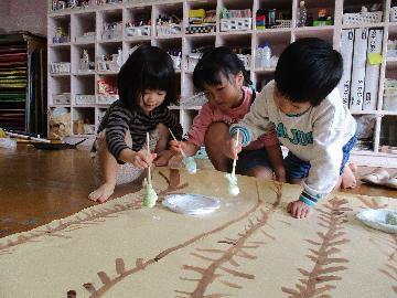 見立てあそびが好きな2歳児の子どもたちは、ポンプボトルに色水を作ると「じゅーすやさんですよ」と言い、お店屋さんになりきっています。「じゅーすください」と来た友だちに「おかねはらってからです」と言ったり、お金をもらうと「どうぞ」とカップに入れて渡してあげたりしながら楽しむ姿があります。友だちとやりとりする楽しさを感じたり、身近な食材などいろいろなものに見立て、イメージを膨らませながら遊んでいます。