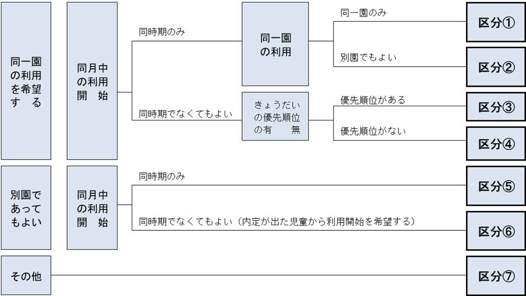 京都市では、きょうだいの同一園への入所を希望する場合、加点(15点)の対象としています。また、保護者のニーズを踏まえ、利用調整において、入所時期及び利用施設等について、次のフローチャートのとおり、細分化しています。