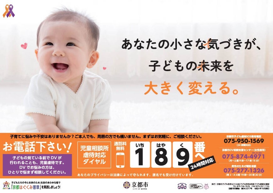 全国的に児童虐待が深刻化し、子どもの生命が奪われる痛ましい事件が増加する中、京都市では、市民一人ひとりが周囲の子どもたちに関心を持ち、虐待に気付き、ためらわずに行動(通告)することを促すとともに、子育てに悩む保護者からの相談を促進するため、児童虐待防止啓発事業を行っています。