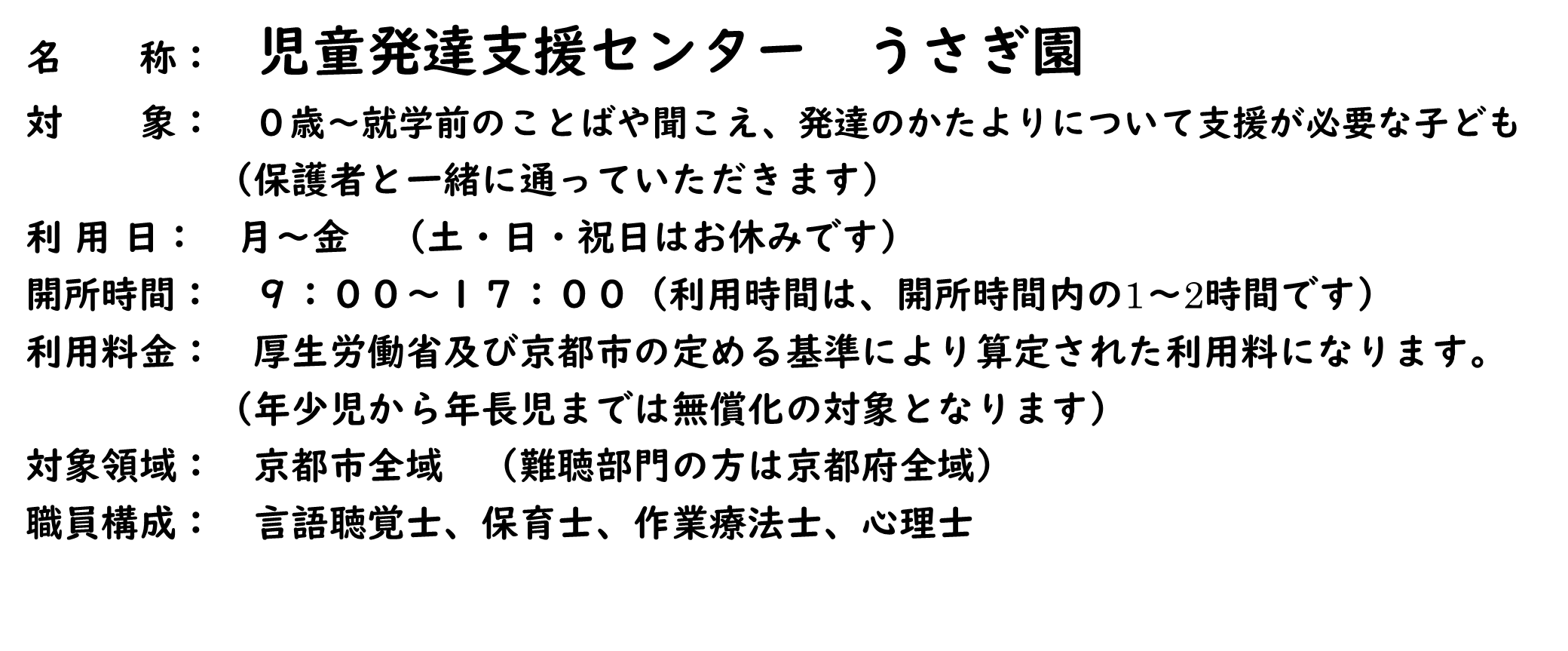 児童発達支援センターうさぎ園 電話:075-950-1567 ファックス:075-950-1381