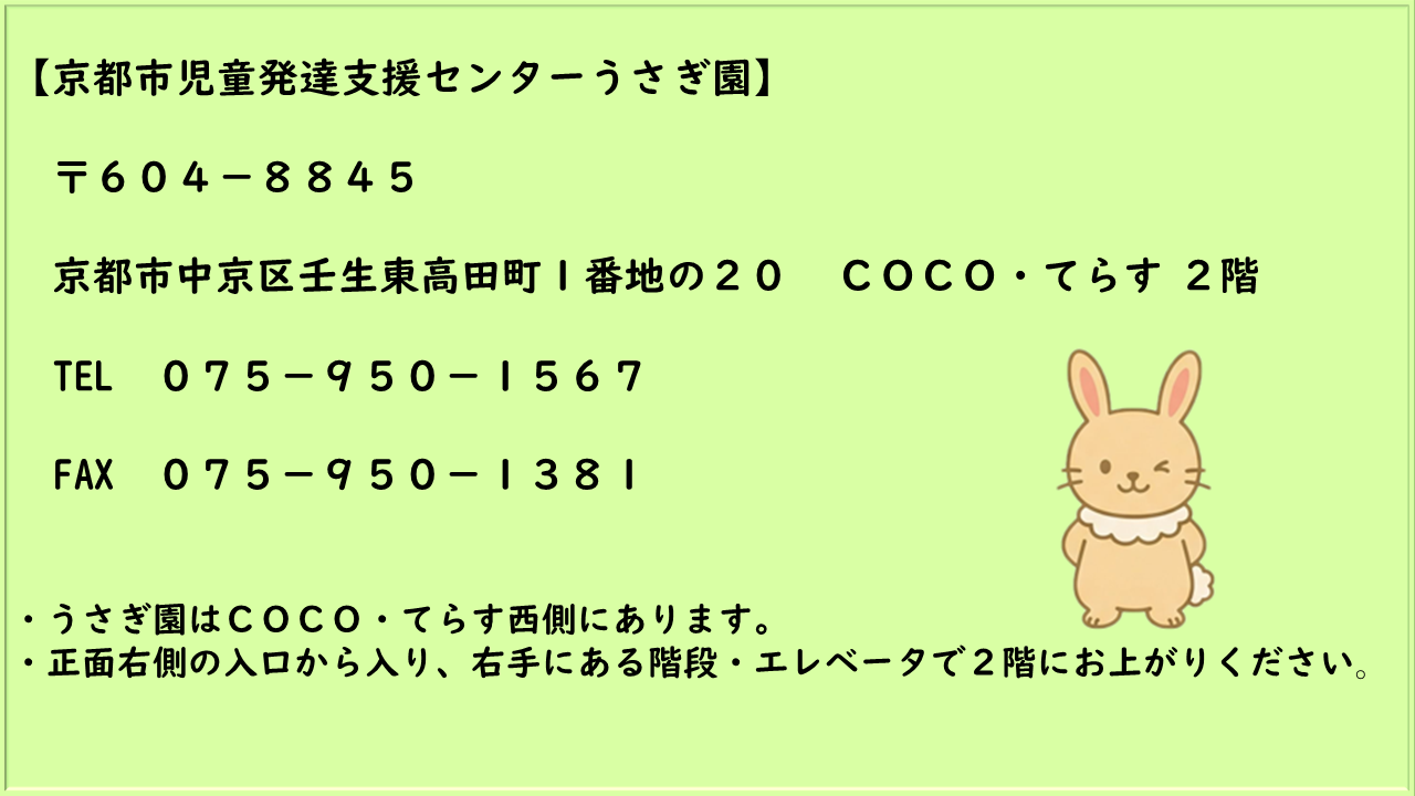 児童発達支援センターうさぎ園 電話:075-950-1567 ファックス:075-950-1381