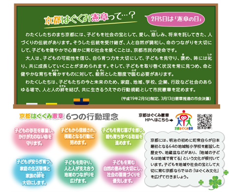 平成19年2月、次代を担う子どもたちが健やかに生まれ育つ社会を目指し、大人として何をすべきか、市民共通の行動規範として「京都はぐくみ憲章(子どもを共に育む京都市民憲章)」を制定しました。本市では、この市民憲章の普及啓発と、憲章に基づく実践行動を促すことにより、家庭、地域、学校、企業、行政など、社会のあらゆる場において行動の輪を広げ、子どもを健やかに育む社会の実現を目指しています。