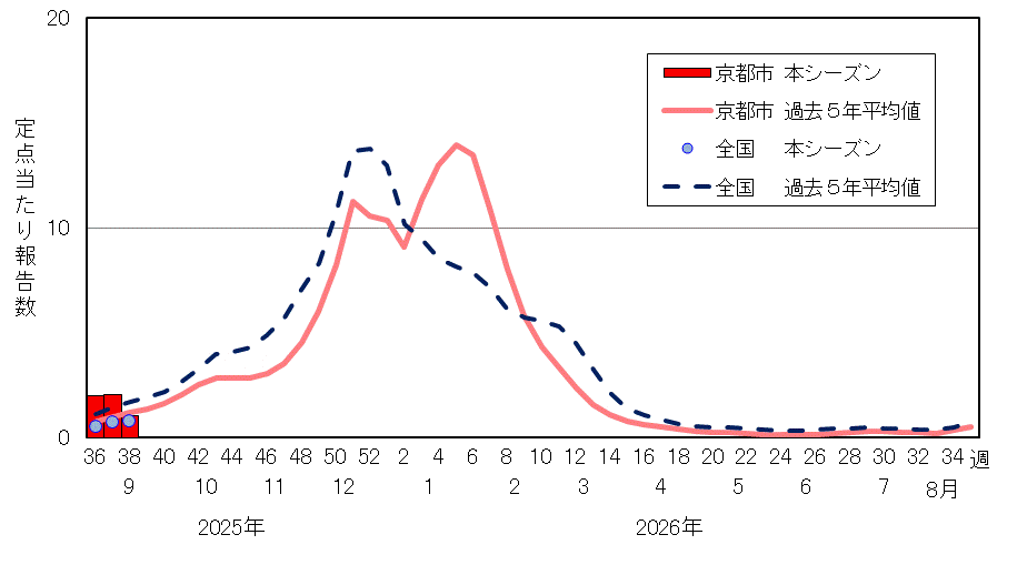 ※ 定点当たり報告数とは、定点医療機関からの報告数を定点数で割った値のことで、言い換えると1医療機関当たりの平均報告数のことです。 京都市のインフルエンザについては、35箇所の定点医療機関からの報告があります。