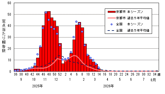| 年 | 週 | 期間 | 京都市定点当たり | 全国定点当たり | ||