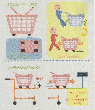 買い物カートの前方部分を開くことで楽に移すことができる。更にかごにローラーをつけることによって,少しの力で転がってくれる。ローラーの付いたかごは小さい子どもでも楽にたくさん買い物をすることができる。誰でも楽に買い物を楽しめる。