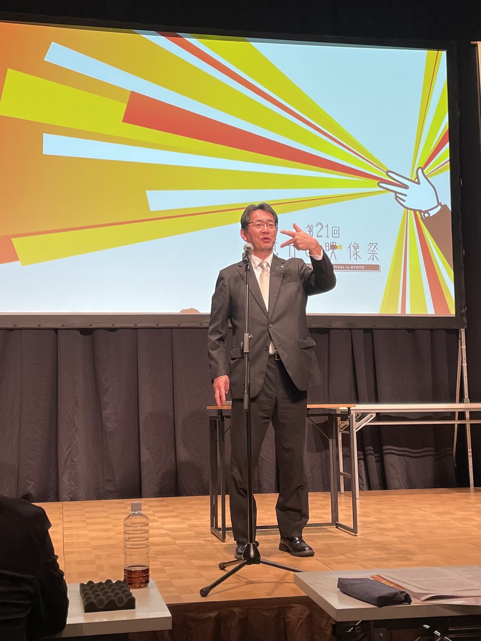 その後、受賞作品の上映があり、観覧させていただいた吉田良比呂京都市副市長より、「ろう者・難聴者ならではの視点、気づき、受け止めが受賞作ごとに、鮮やかに、あるいは巧みに表現されている。審査員からのお話にもあったように、私も自身の心の動きを感じ、深い余韻を味わっている」「『手話に関する施策の推進に関する法律』の制定といった時機をとらえ、手話言語条例がある本市としても、手話があらゆる場面で言語として尊重される環境整備に取り組み、全ての方々に「居場所」と「出番」がある社会を実現してまいりたい」とご挨拶いたしました。