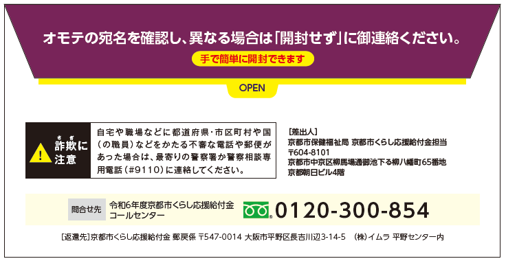 ・京都市や国、内閣府などが、「京都市くらし応援給付金」の支給をするために現金自動預払機(ATM)の操作をお願いすることは、絶対にありません。
