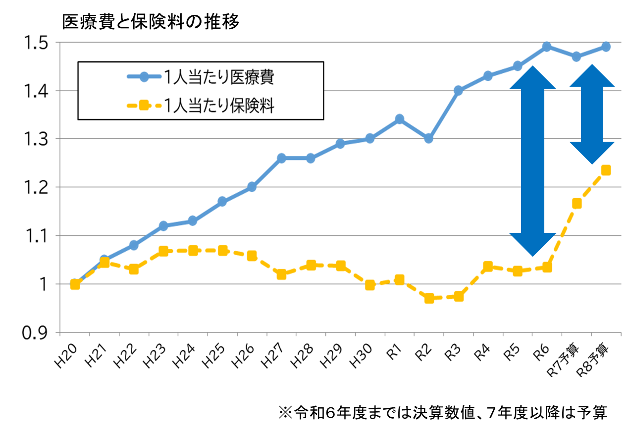それでも不足する分は、国保基金や一般会計から多額の臨時支援を行うことで、保険料を抑制してきましたが、医療費と保険料との伸びの差が拡大し、収支不足が深刻化しました。