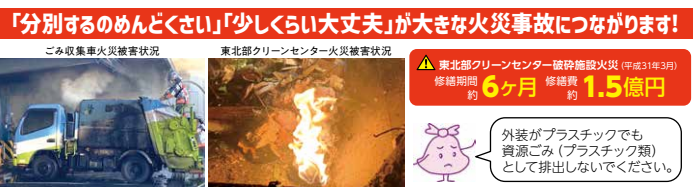 充電式電池が内蔵された小型家電製品が正しく分別されずに出されることにより、市内のごみ収集車やごみ処理施設で火災が発生する事例が増えています。