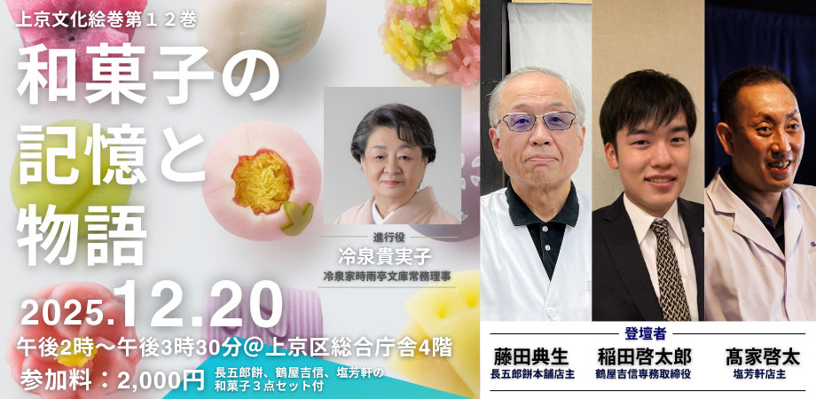 12回目となる今回は、進行役に上京区文化振興会の冷泉貴実子会長、登壇者に老舗和菓子店の3名をお迎えし「和菓子の記憶と物語」をテーマとしたスペシャルトークセッションを開催いたします。