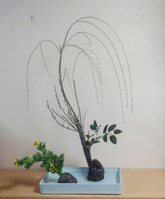 人日の節句に合わせた正月飾りと迎春花のいけばな等の展示