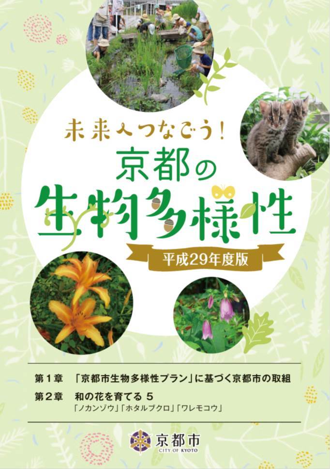 京都市では、将来にわたり生物多様性の恵みを確保し、享受していくため、「京都市生物多様性プラン(2021-2030)」に基づき、生物多様性の保全と持続可能な利用に向けた取組を推進しており、この取組に関する理解を深め、行動の促進を図るため、生物多様性に関する資料を発行しています。