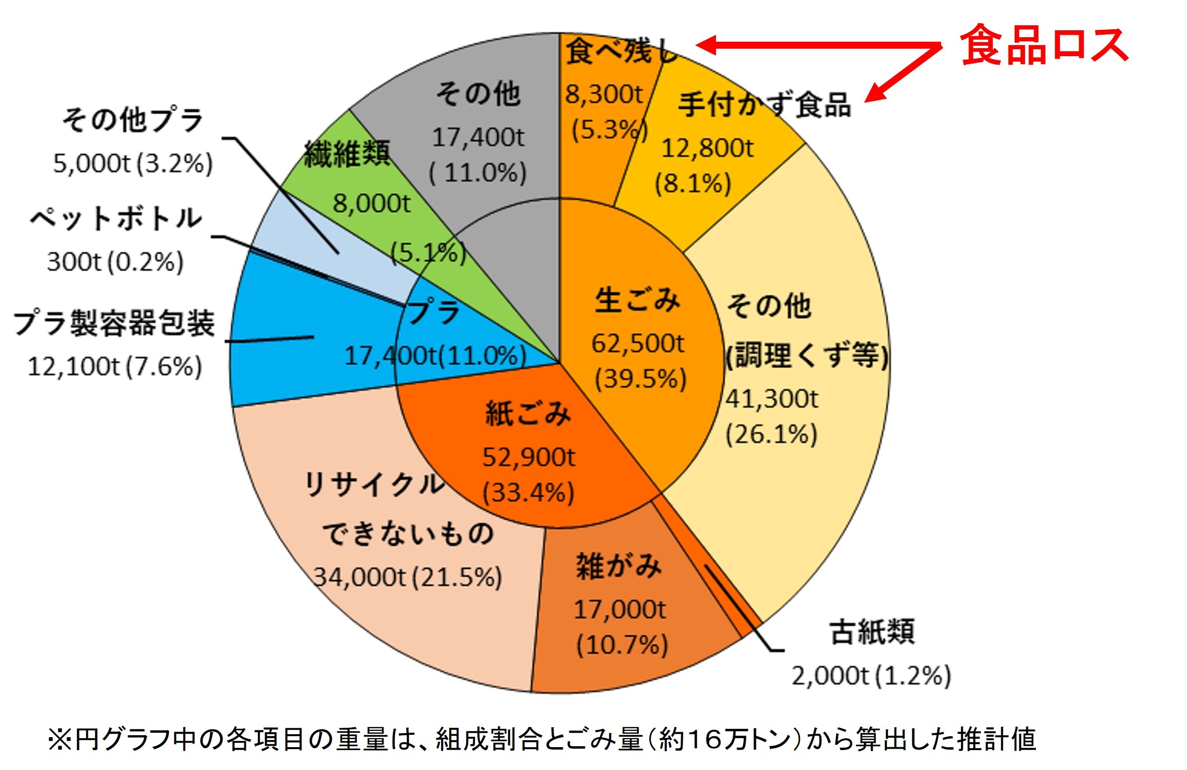 - 手付かず食品や食べ残しといった「食品ロス」が約2.11万トン、リサイクルが可能な紙ごみが約1.90万トン、プラ製容器包装などのプラ類が約1.74万トン排出されており、この3つがごみ減量・分別リサイクルのターゲットとなります。
