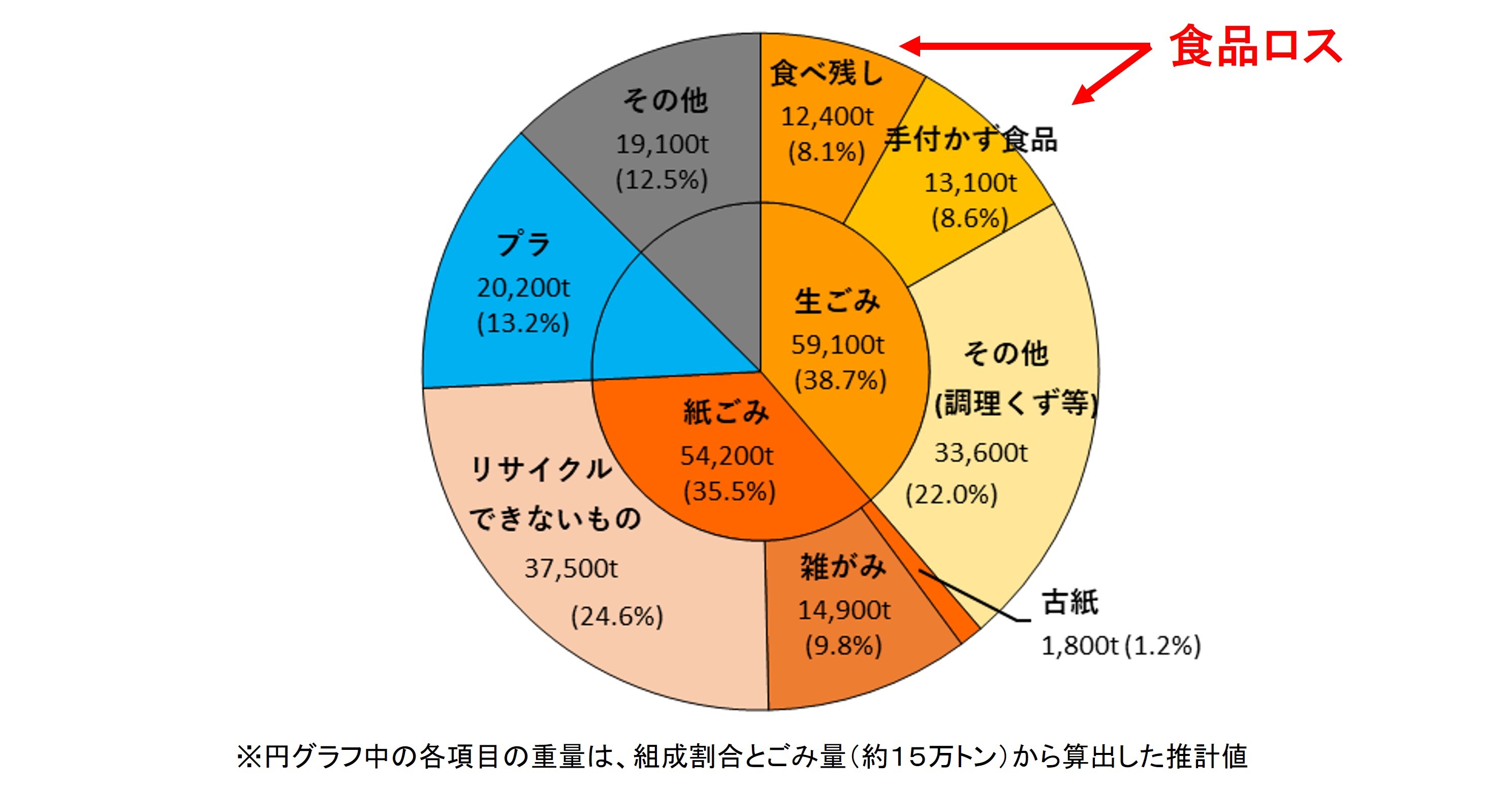 - 手付かず食品や食べ残しといった「食品ロス」が約2.55万トン、リサイクル可能な紙ごみが約1.67万トン排出されており、この2つがごみ減量のターゲットとなります。