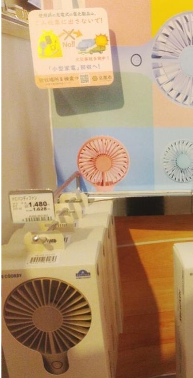 宣言に合わせて、市内で初めて、お客様の商品購入の機会をとらえて、売り場で使用済みのポータブル扇風機やモバイルバッテリーなど、充電式小型家電の適正分別を啓発しています。