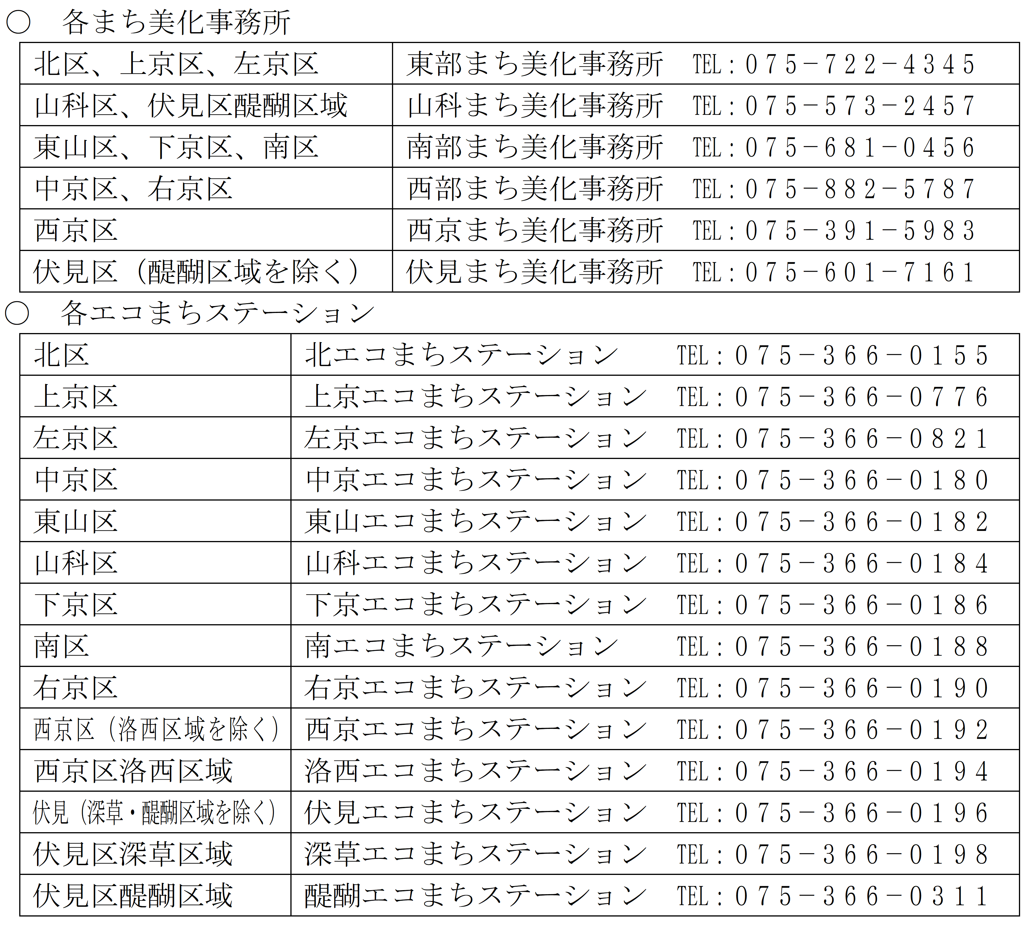 電話:【資源循環推進課】075-222-3946【まち美化推進課】075-222-3952、美化・し尿担当075-222-3953【廃棄物指導課】075-222-3957