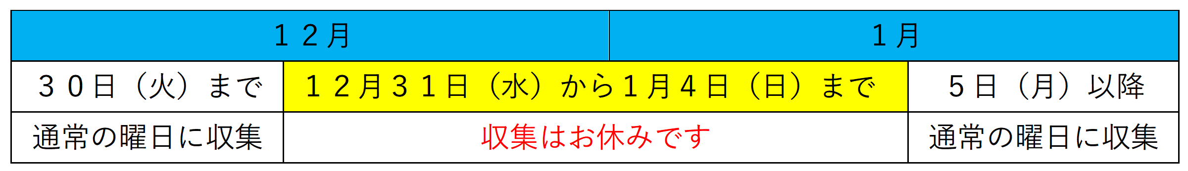 12月31日(水曜日)から1月4日(日曜日)を除き、通常どおり収集します。