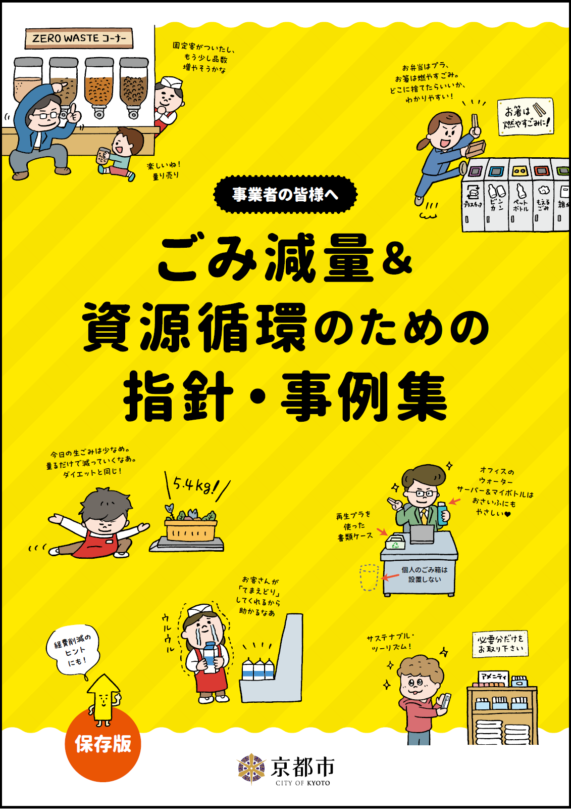 京都市では、食品ロスや使い捨てプラスチックごみ等の事業ごみの減量と資源循環を進めるため、事業者の皆様に是非、実践していただきたい取組や、市内で実践されている具体的な優良事例等をまとめた「ごみ減量&資源循環のための指針・事例集」を発行します。