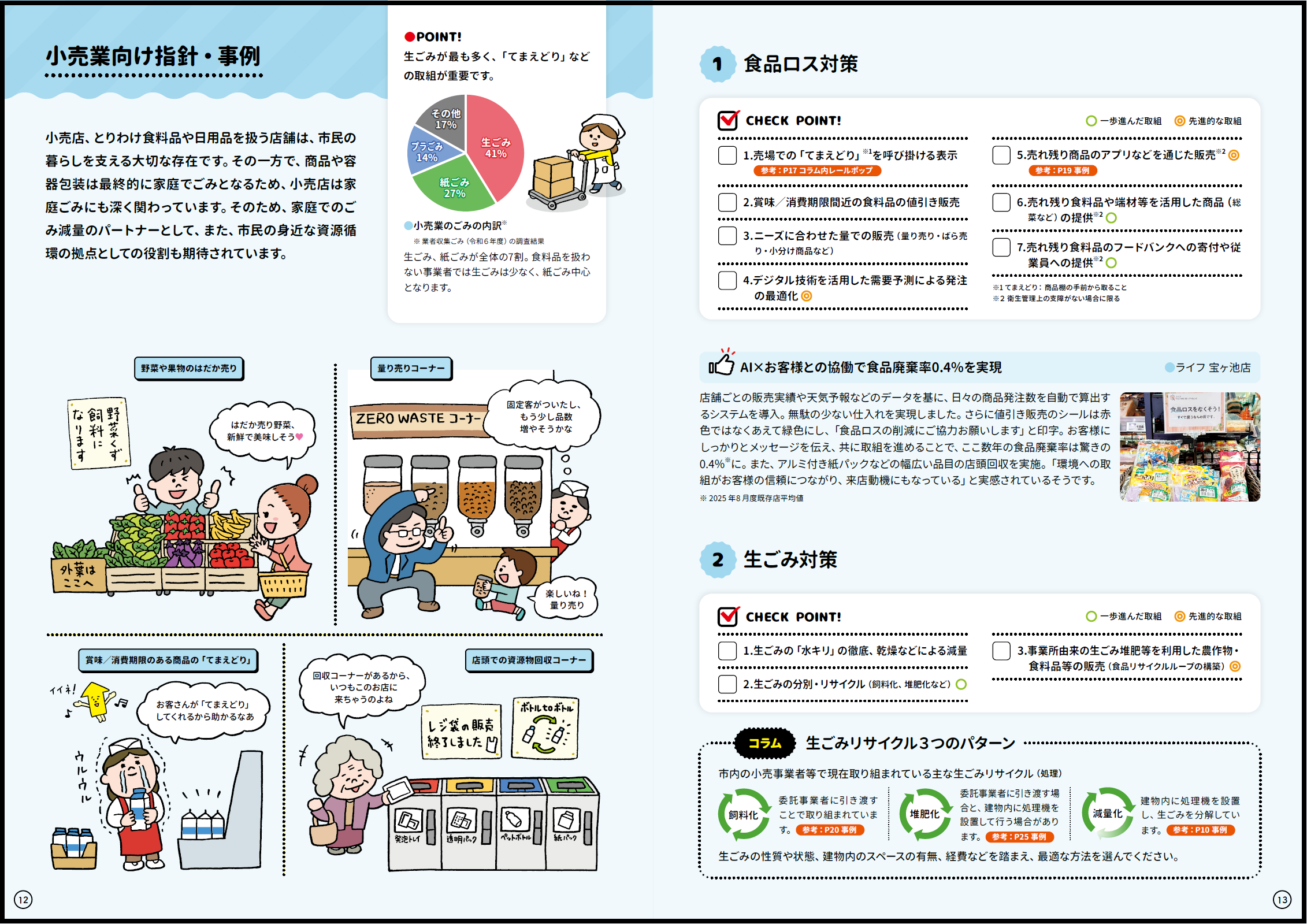 - 全ての事業所で実践していただきたい取組のほか、ごみ量が多い小売業や飲食業・宿泊業などの業種特性に応じたものなど86件の取組と28件の優良事例を紹介