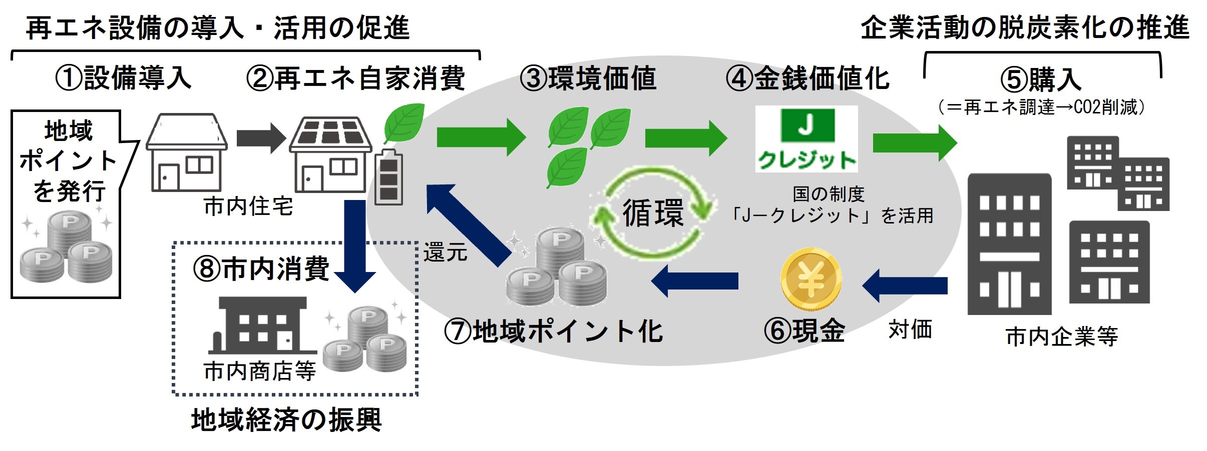 京都市では、脱炭素社会の実現に向けて、太陽光発電設備の普及拡大などに取り組んでおり、市民の御家庭での太陽光発電で生み出される環境価値(CO2削減量)を取りまとめてクレジット化し、市内企業等の皆様に購入・活用いただくことで、各御家庭に地域ポイントとして還元する取組を実施しています。