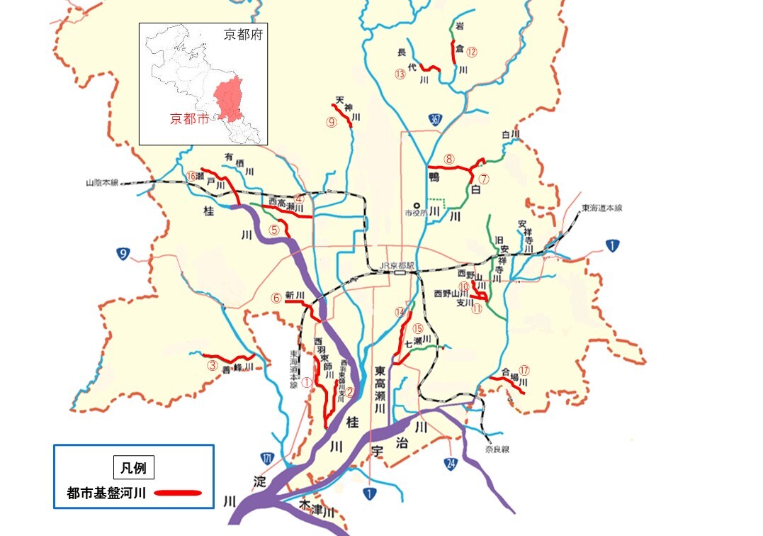 都市基盤河川改修事業には、本来法河川であって府等が改修事業を行ってきたものを本市が引き継いだもの、本来普通河川であったものを早期改修の必要上、法河川に格上げして都市基盤河川改修事業制度の適用を受けるようにしたものがあります。