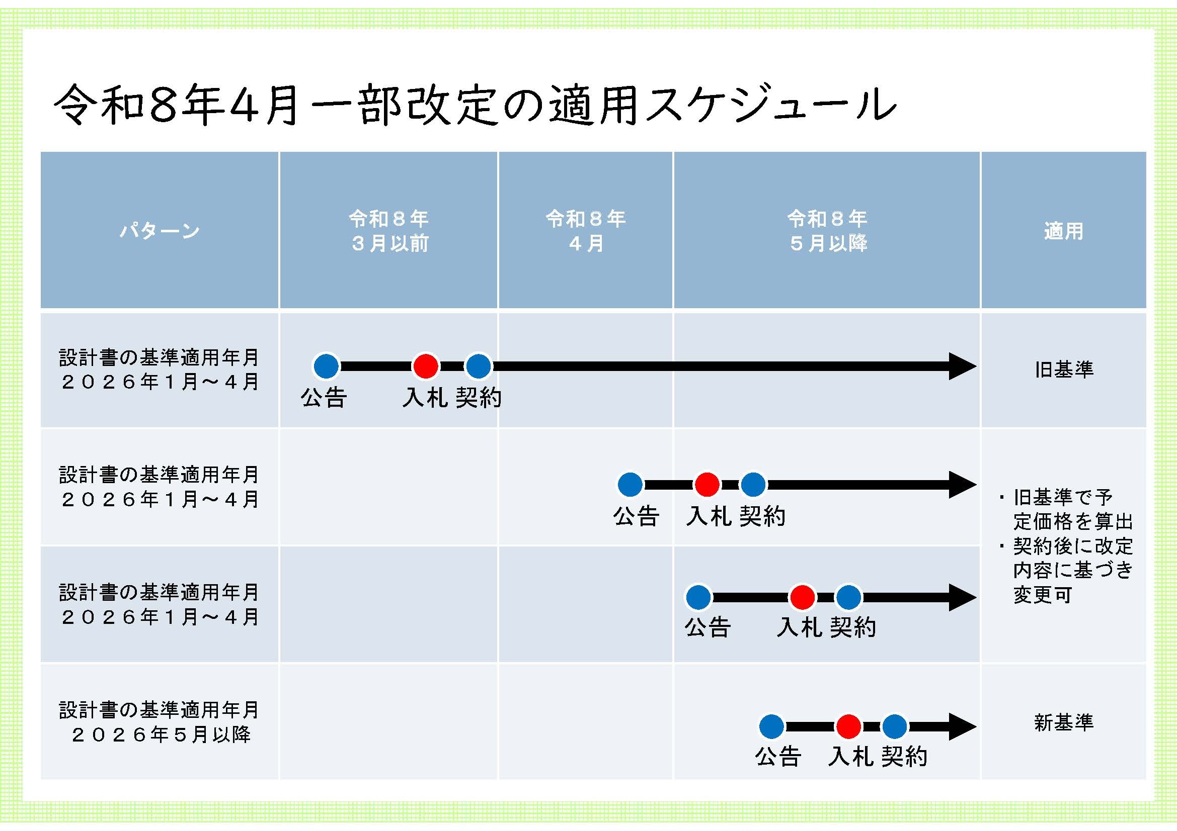 ただし、令和8年4月1日以降に入札公告(随意契約では見積合わせ通知)する工事のうち、基準適用年月を2026年4月(令和8年4月)以前とする設計書は、当該契約については旧基準を適用し、請求のあったものに限り、改定後基準による設計変更の対象とします。
