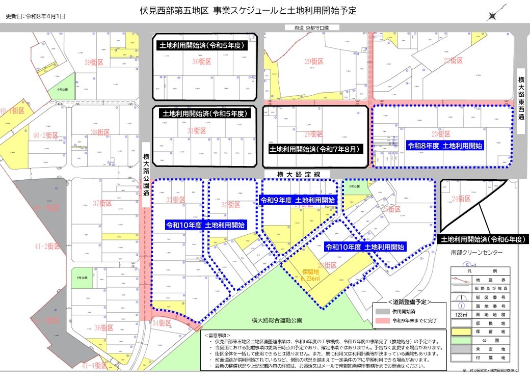 伏見西部第五地区土地区画整理事業は、令和14年度の工事概成、令和17年度の事業完了(換地処分)を目指しています。