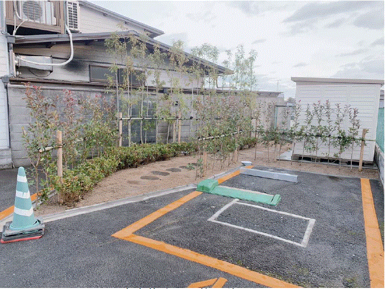 これまでに、平成30年 9件、令和元年度 7件、令和2年度 3件、合計19件のみどりの駐車場が完成しました。駐車場の一角に緑地を設けたものや、緑化ブロックを使用して駐車スペースを緑化したものだけでなく、高木や低木を組み合わせて植栽された駐車場が完成しました。