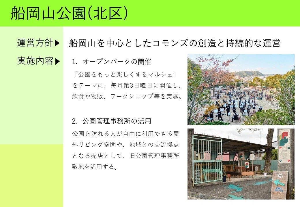 船岡山公園では、令和3年度末から令和6年度まで、地域・民間企業と京都市とが一緒に柔軟な公園の使い方を考え試行する「公民連携 公園利活用トライアル事業」を実施し、株式会社一級建築士事務所STUDIOMONAKAを代表とする「船岡山公園チーム」が、旧公園管理事務所棟を活用した公園管理業務(巡回・ごみ拾い等)や、毎月1回開催のオープンパーク等に取り組んできました。
