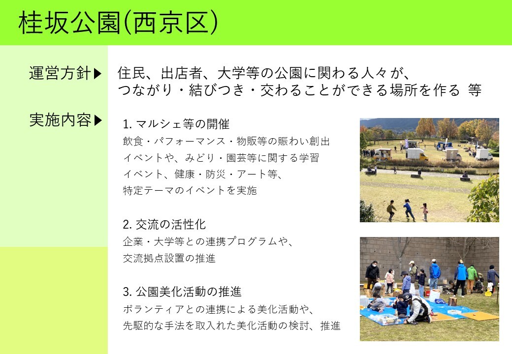 桂坂公園では、令和4年度から5年度まで、地域・民間企業と京都市とが一緒に柔軟な公園の使い方を考え試行する「公民連携 公園利活用トライアル事業」の枠組みで、農産物販売等のマルシェの開催や、スイーツ販売等のキッチンカーの出店に取り組みました。