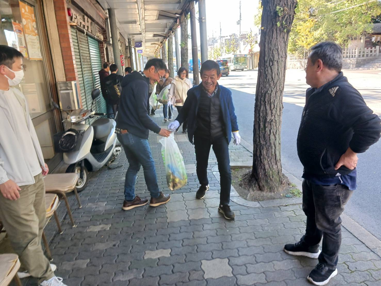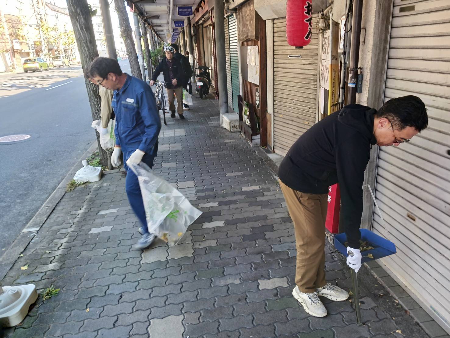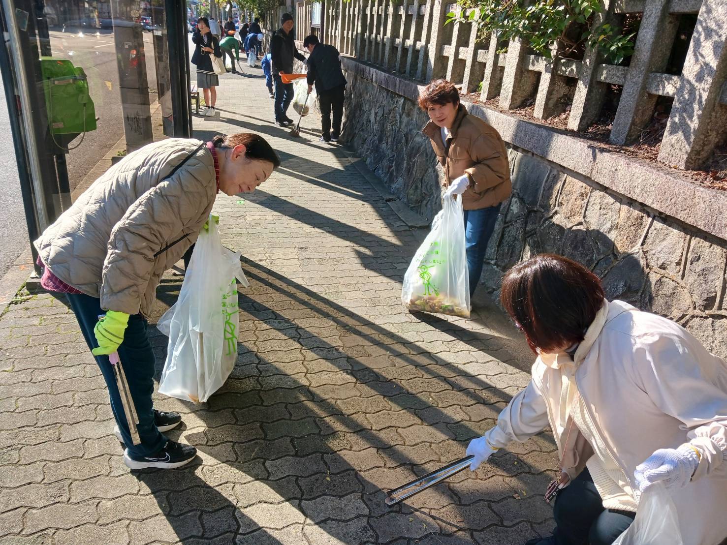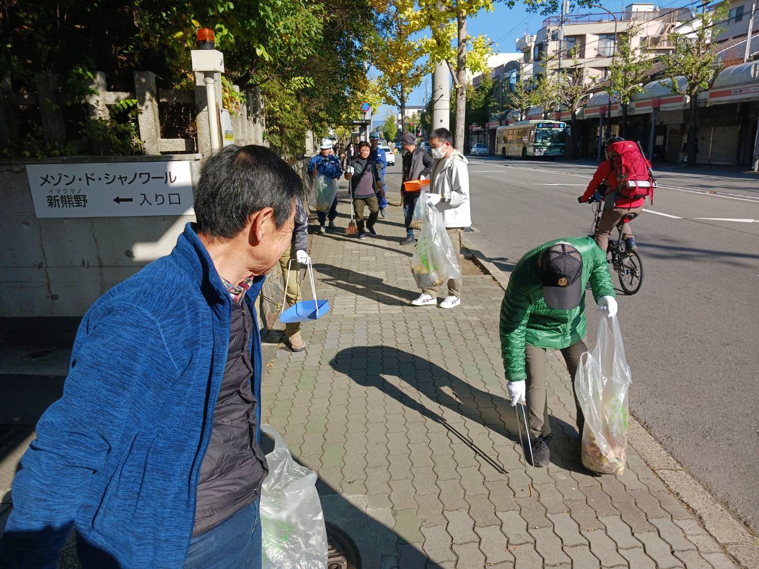 今熊野商店街振興組合が主催するこの一斉清掃では、東大路通の塩小路通~泉涌寺道交差点付近の間を2グループに分かれそれぞれで清掃活動に取り組まれました。今熊野商店街振興組合の方々だけでなく、今熊野学区や一橋学区の方々も参加され、25名が集まりました。参加者全員で楽しく交流しつつ清掃活動をされ、顔の見える関係づくりがされました。
