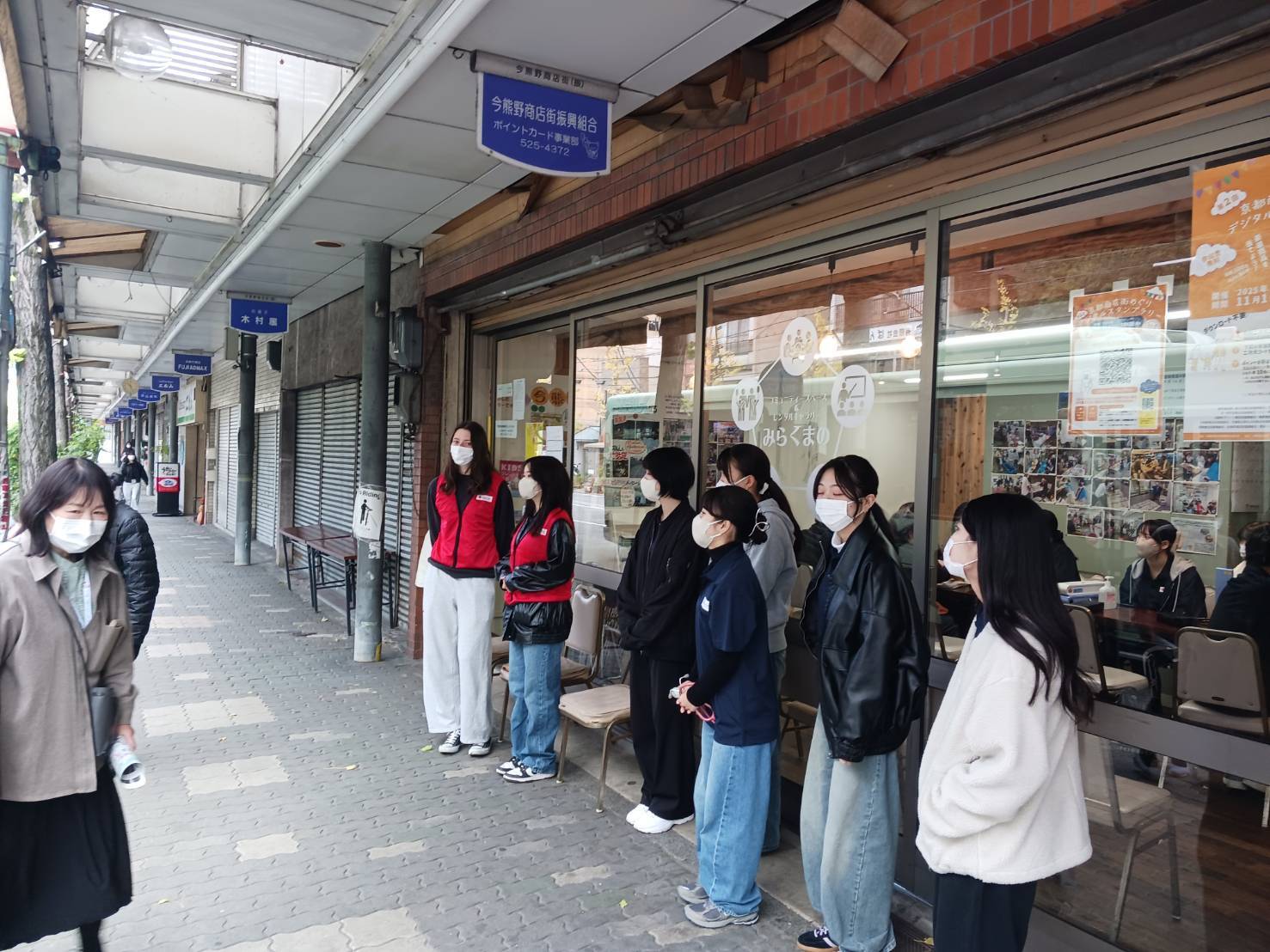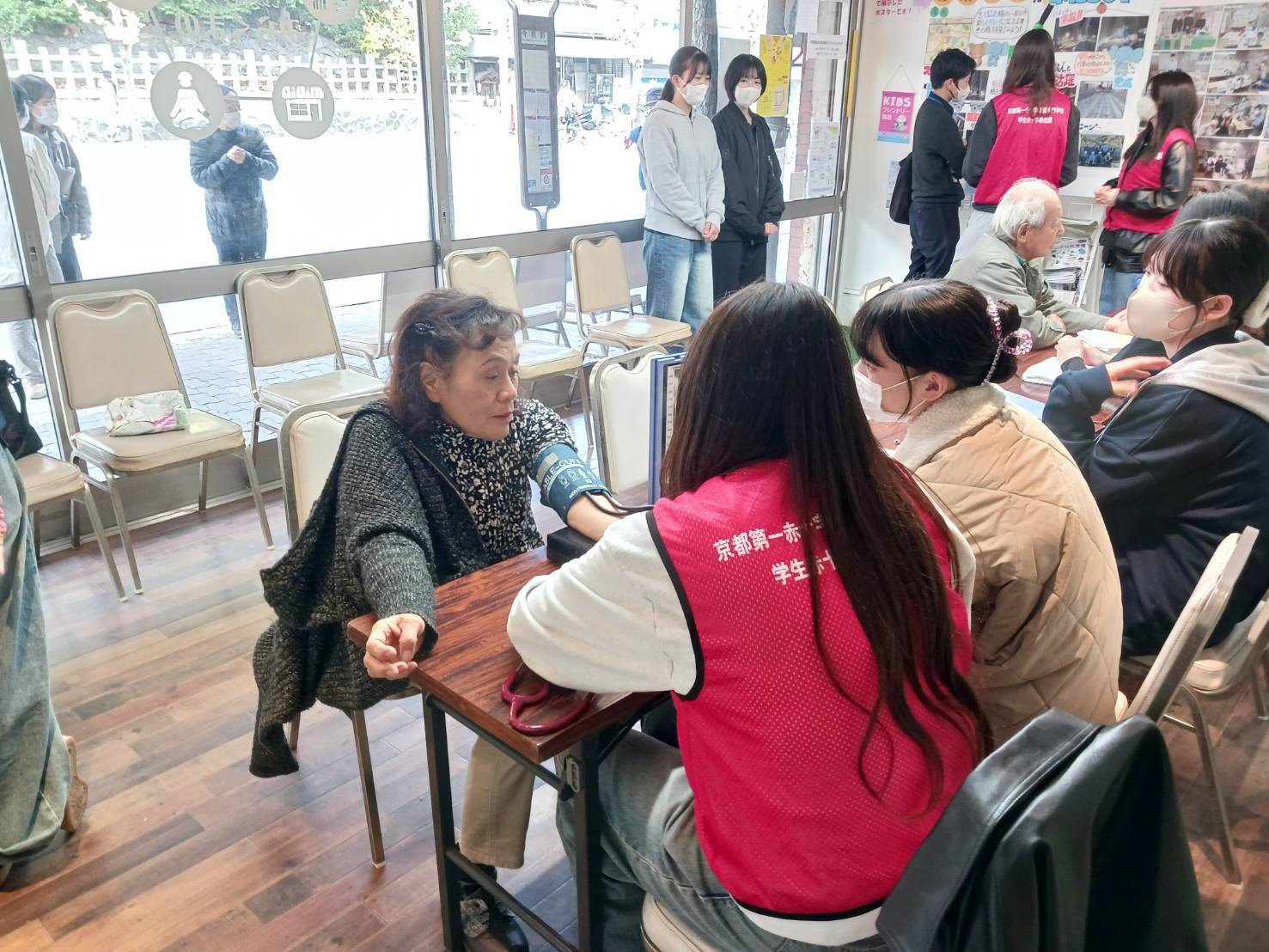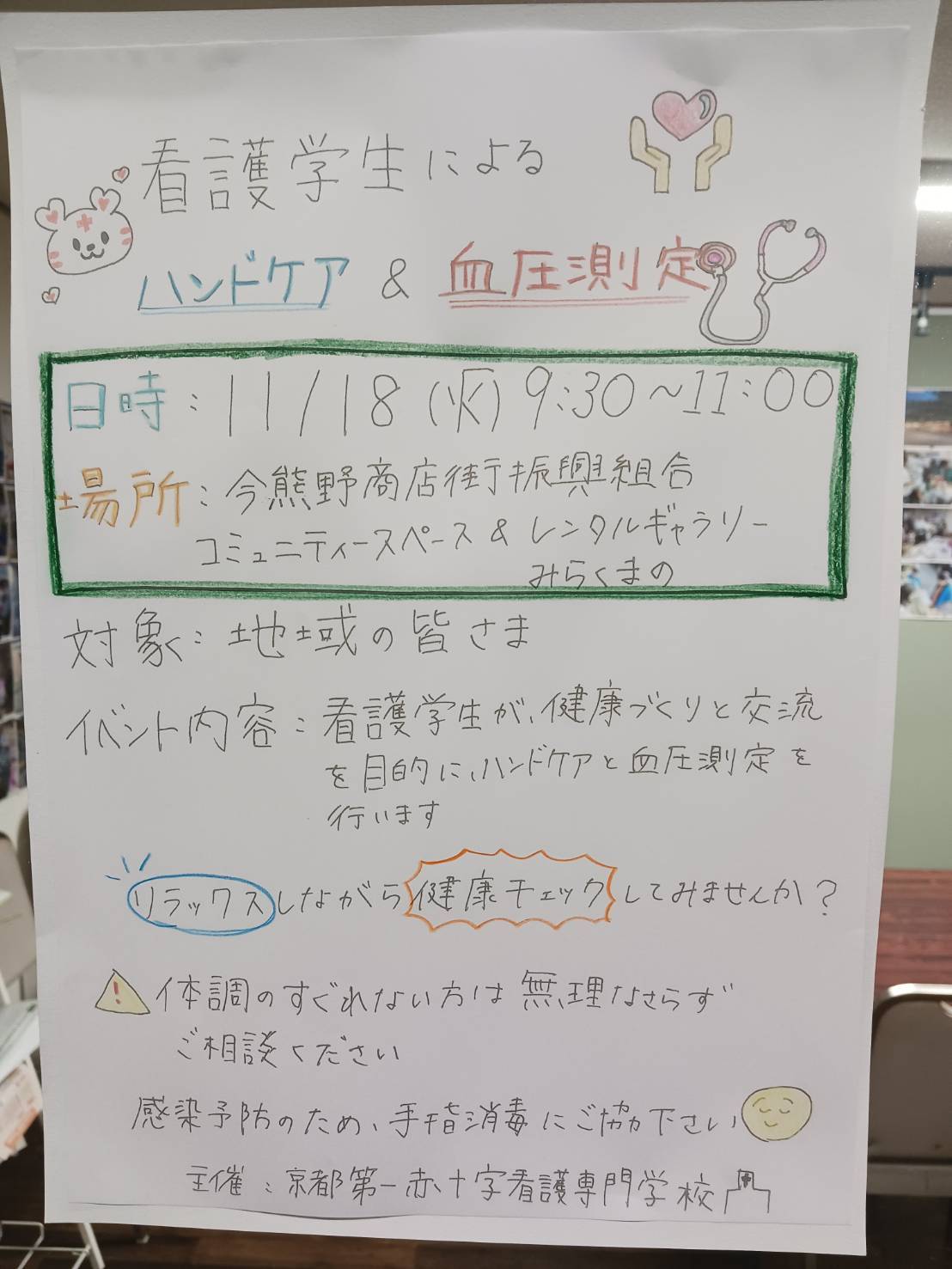 令和7年11月18日に「今熊野商店街振興組合コミュニティスペースみらくまの」において京都第一赤十字看護専門学校の看護学生がハンドケア&血圧測定を開催しました。京都市も今熊野橋架替工事ポスター等を展示し、参加者へ工事進捗についてPRしました。