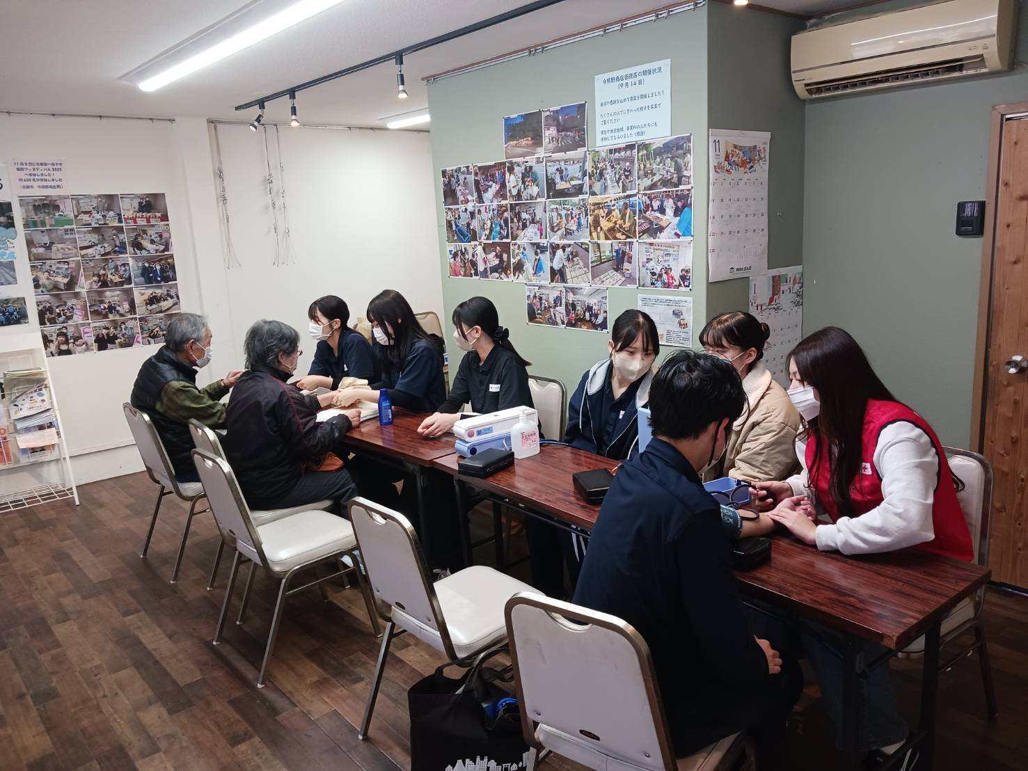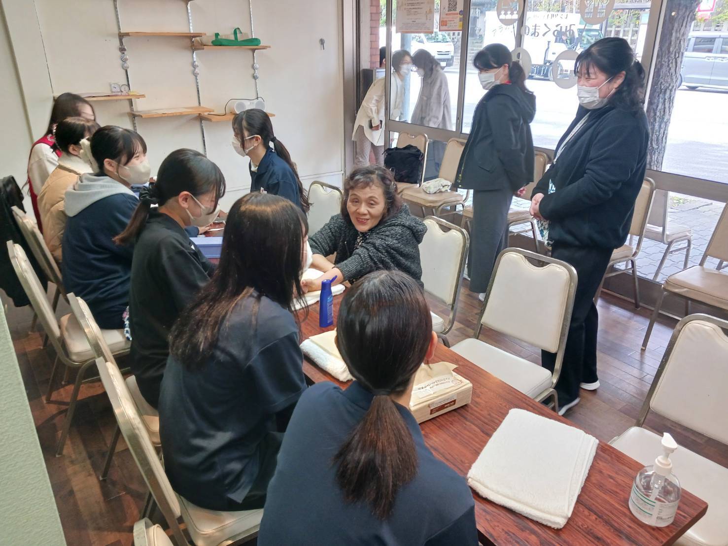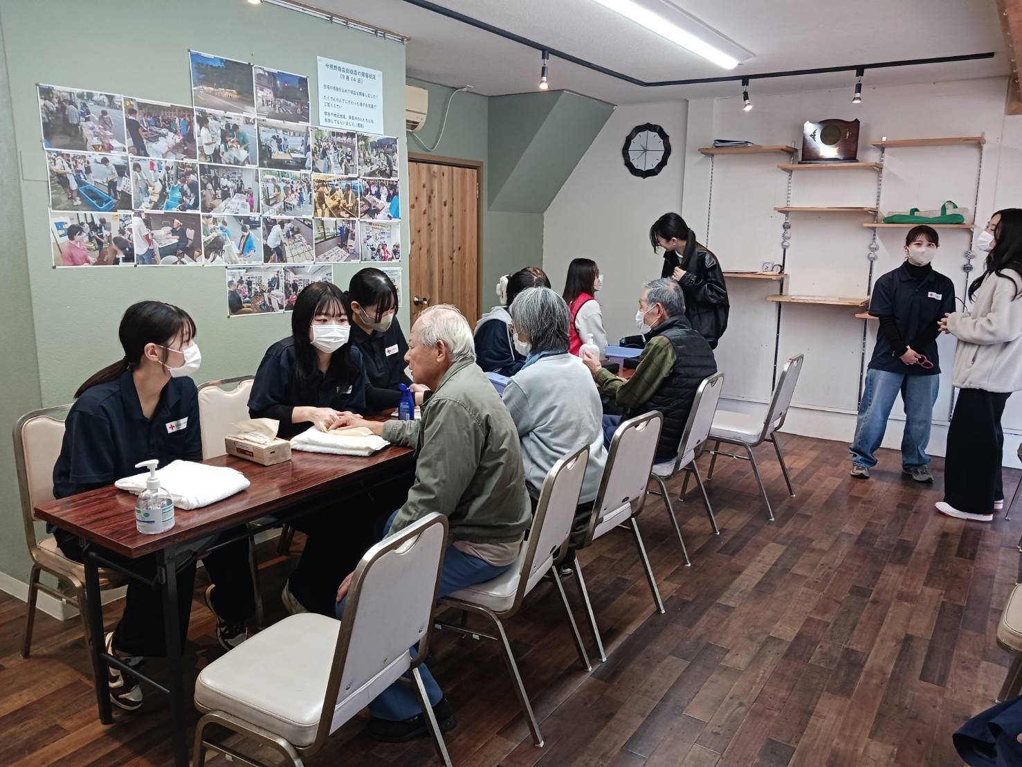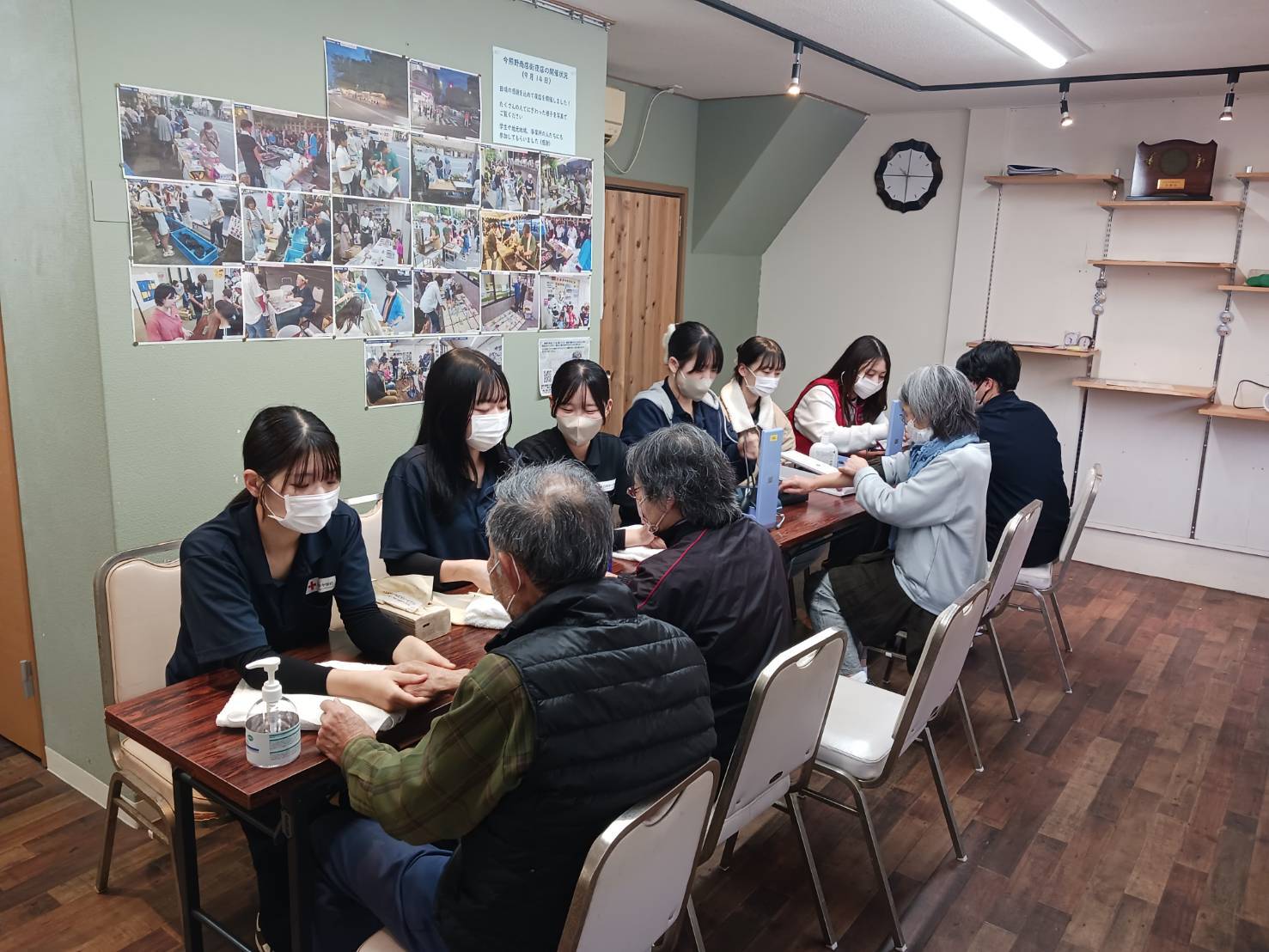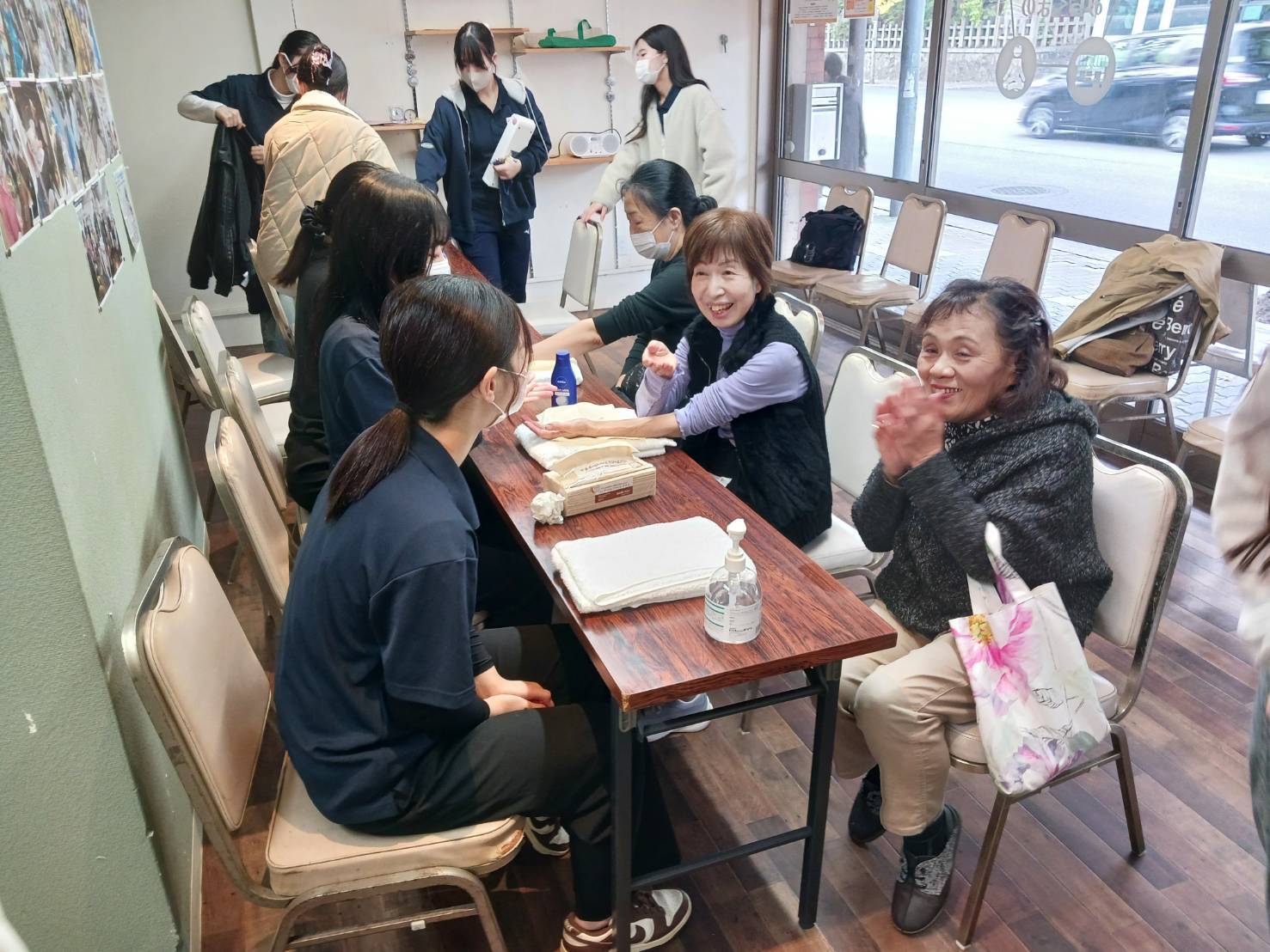 看護学生が文化祭事業の一環で開催した「看護学生によるハンドケア&血圧測定」は、看護学生1~3年生が地域の人たちを対象に健康づくりと交流を目的にハンドケアと血圧測定が行われました。当日、コミュニティスペースみらくまので開催されていた健康体操の参加者にも参加してもらい、看護学生によるにぎやかな雰囲気のなか、健康相談と地域交流がなされました。
