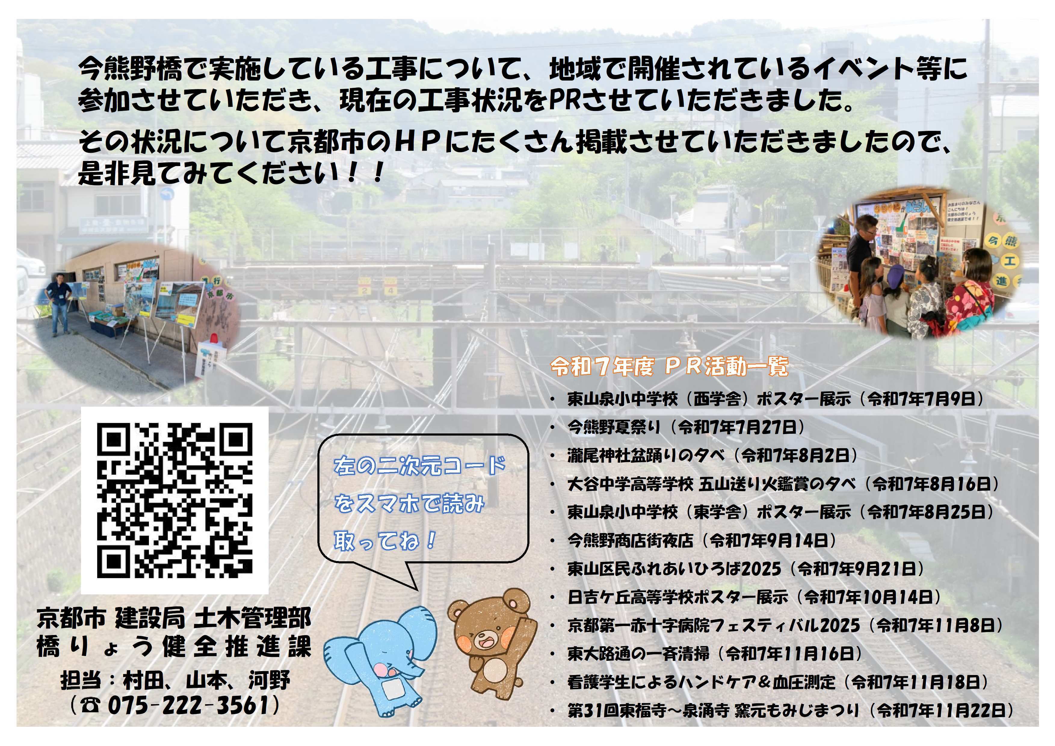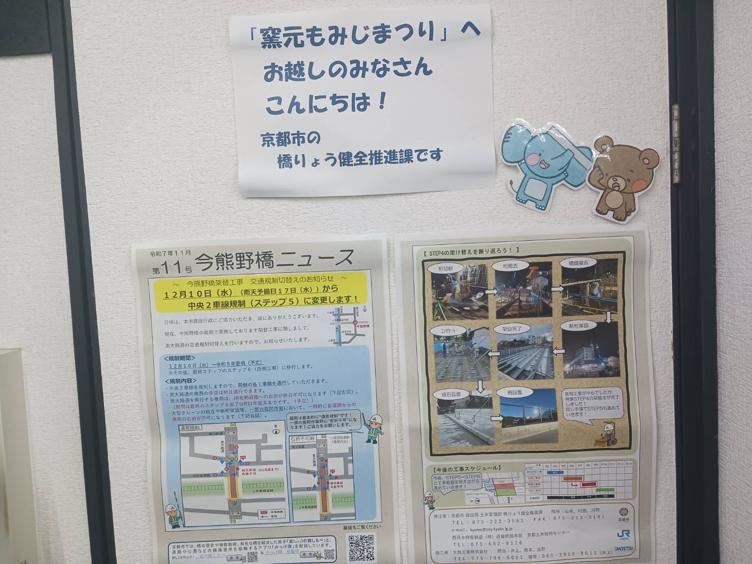 令和7年11月22日・23日・24日・29日・30日に「青窯会会館」の周辺地域のもみじまつり会場において京都青窯会共同組合の主催で大陶器市の「第31回東福寺~泉涌寺 窯元もみじまつり」が開催されました。京都市も今熊野橋架替工事の情報を掲載した「今熊野橋ニュース」等を展示し、参加者へ工事進捗についてPRしました。